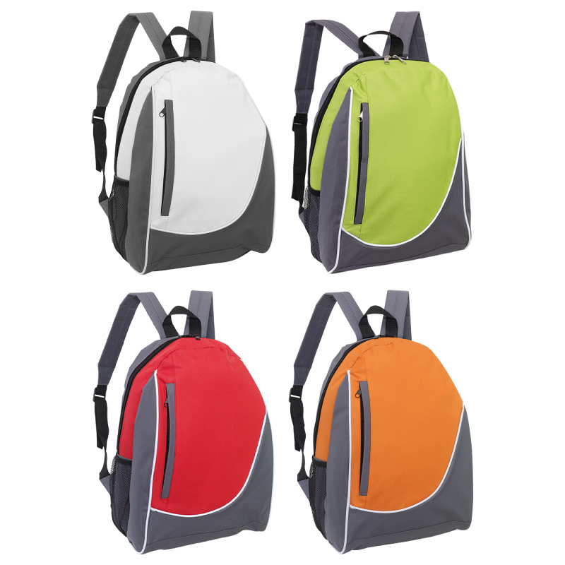 28,5 x 15 x 39,5 cm. Capacidad 14 litros. Aprox. Polyester 600D. Bolsillo frontal con cierre, vivos blancos. Un compartimento principal. Correas regulables herrajes plásticos.