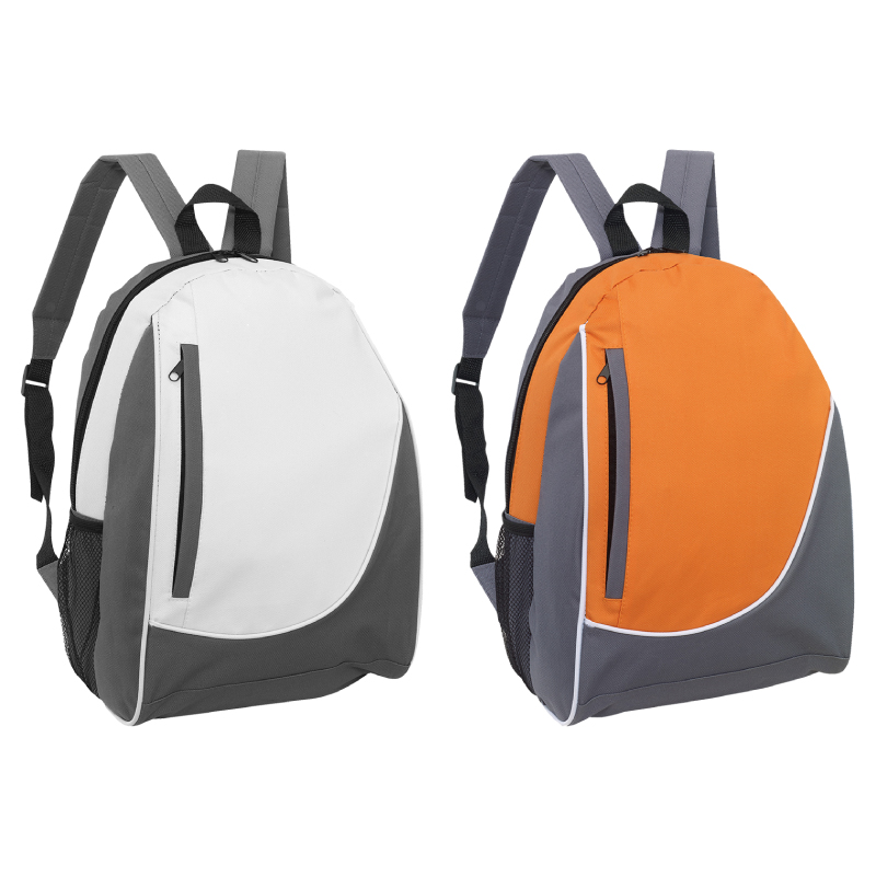 28,5 x 15 x 39,5 cm. Capacidad 14 litros. Aprox. Polyester 600D. Bolsillo frontal con cierre, vivos blancos. Un compartimento principal. Correas regulables herrajes plásticos.
