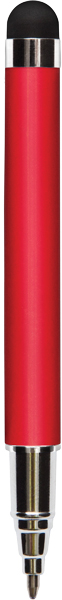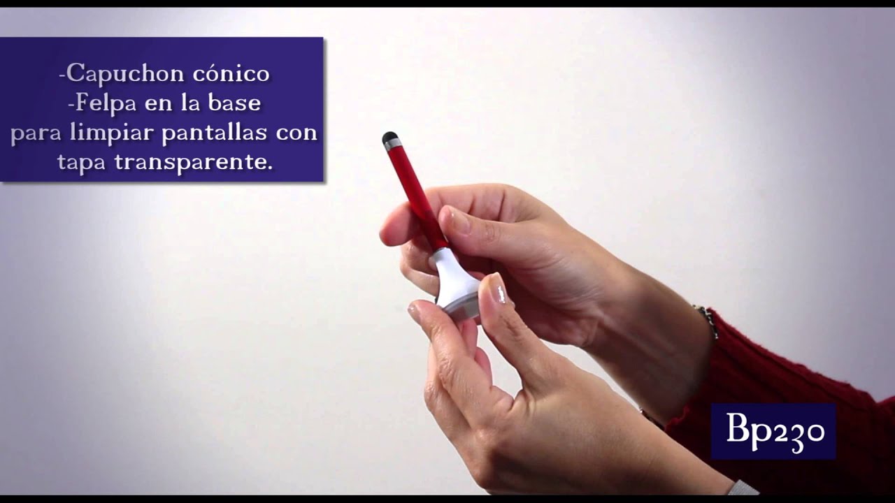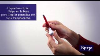 Plástico con touch. Cuerpo de color con detalles en color plata. Capuchón cónico con felpa en su base para limpieza de pantallas, tapa translúcida. Tinta negra.