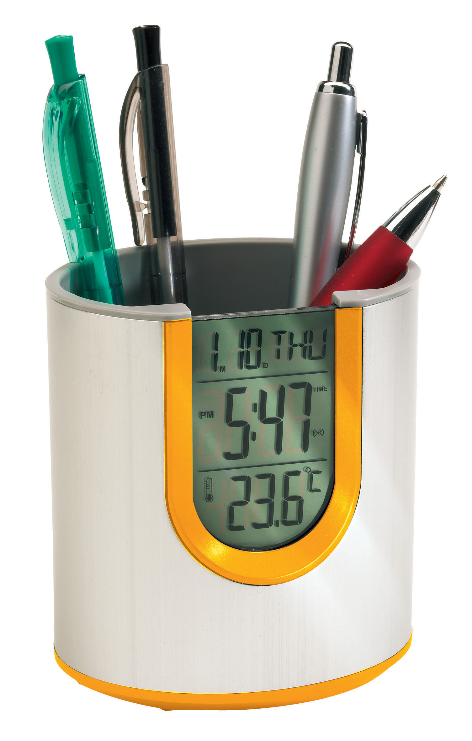 6,5 x 9 x 10 cm LCD. Hora, temperatura, calendario, alarma. Revestido en aluminio. Pilas incluida. Impresión en tampografía. Grabado en láser o pantógrafo.