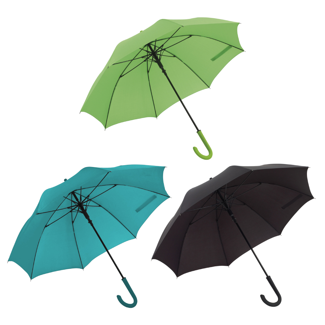 Ø103 cm. Aprox. Bastón metálico, varillas en fibra de vidrio, puntas metálicas y mango curvo de plástico. APERTURA AUTOMÁTICA. Con cierre de velcro.