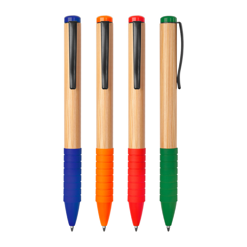Bambú. Cuerpo de madera. Grip de goma, punta y detalle en la parte superior de color. Apertura giratoria. Clip negro metálico.
