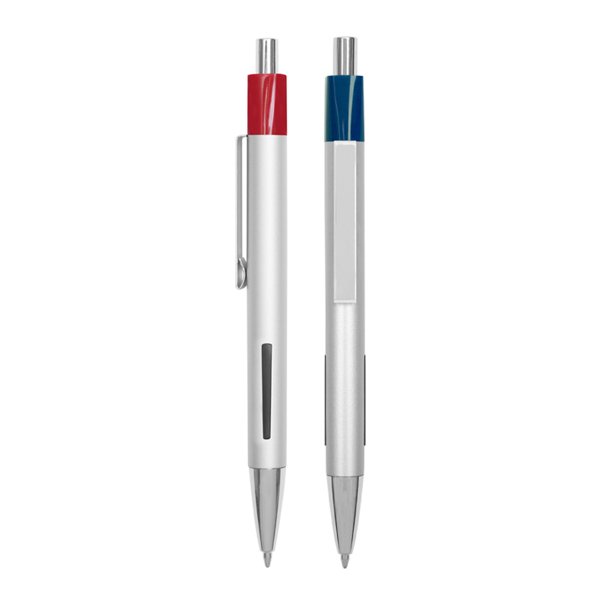 Metál. Cuerpo con acabado mate. Pulsador, clip y punta en metal brillante. Detalle de color en la parte superior. Gomas laterales antideslizantes