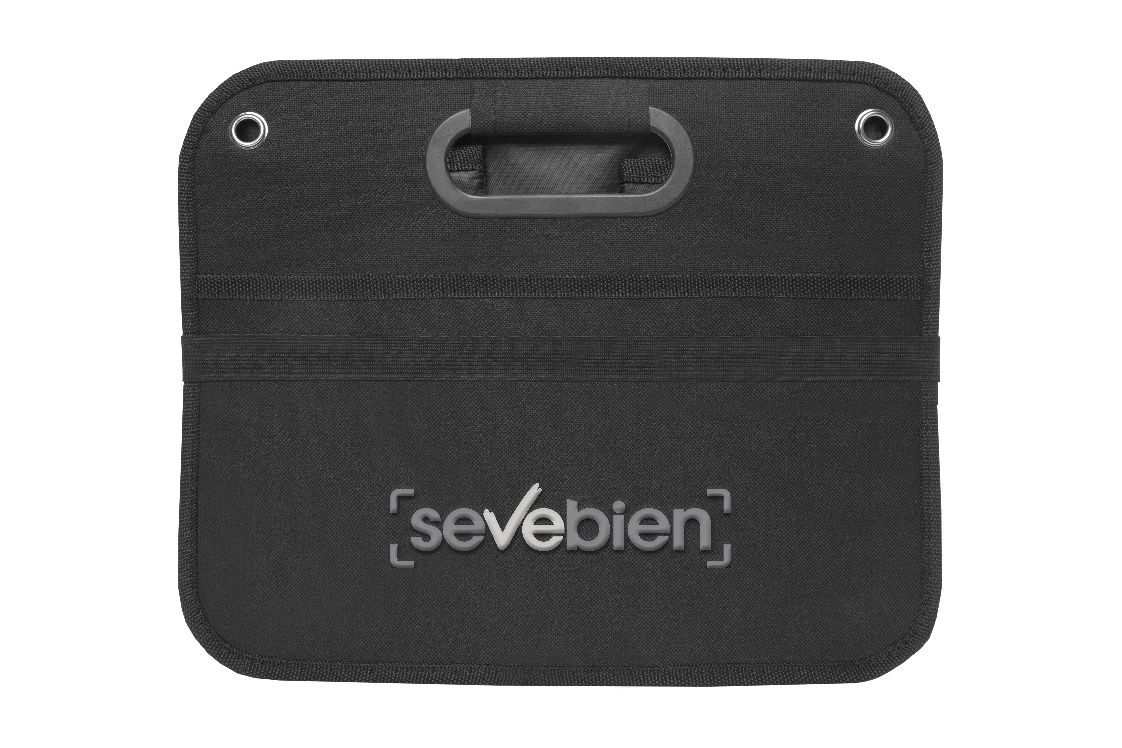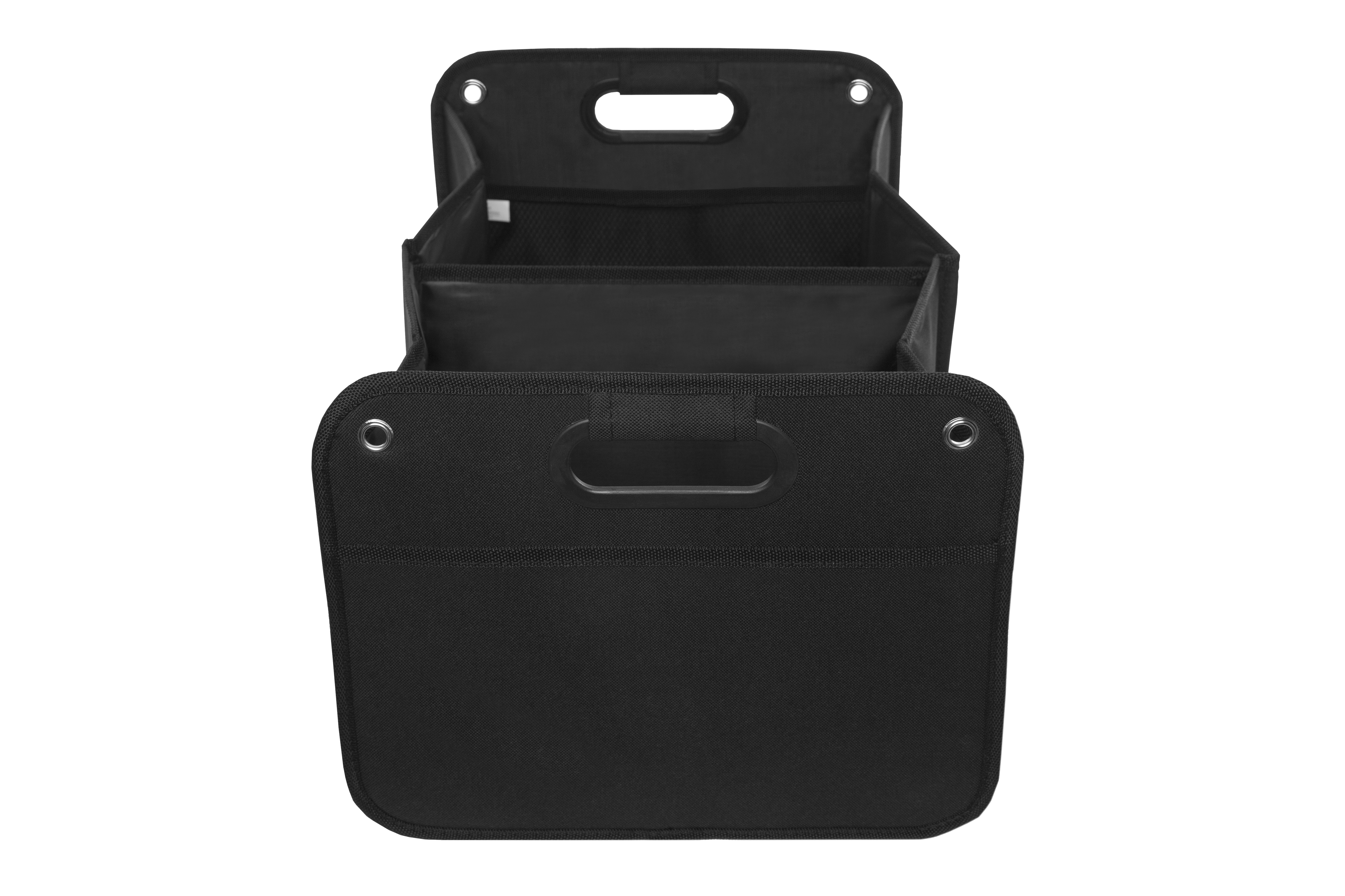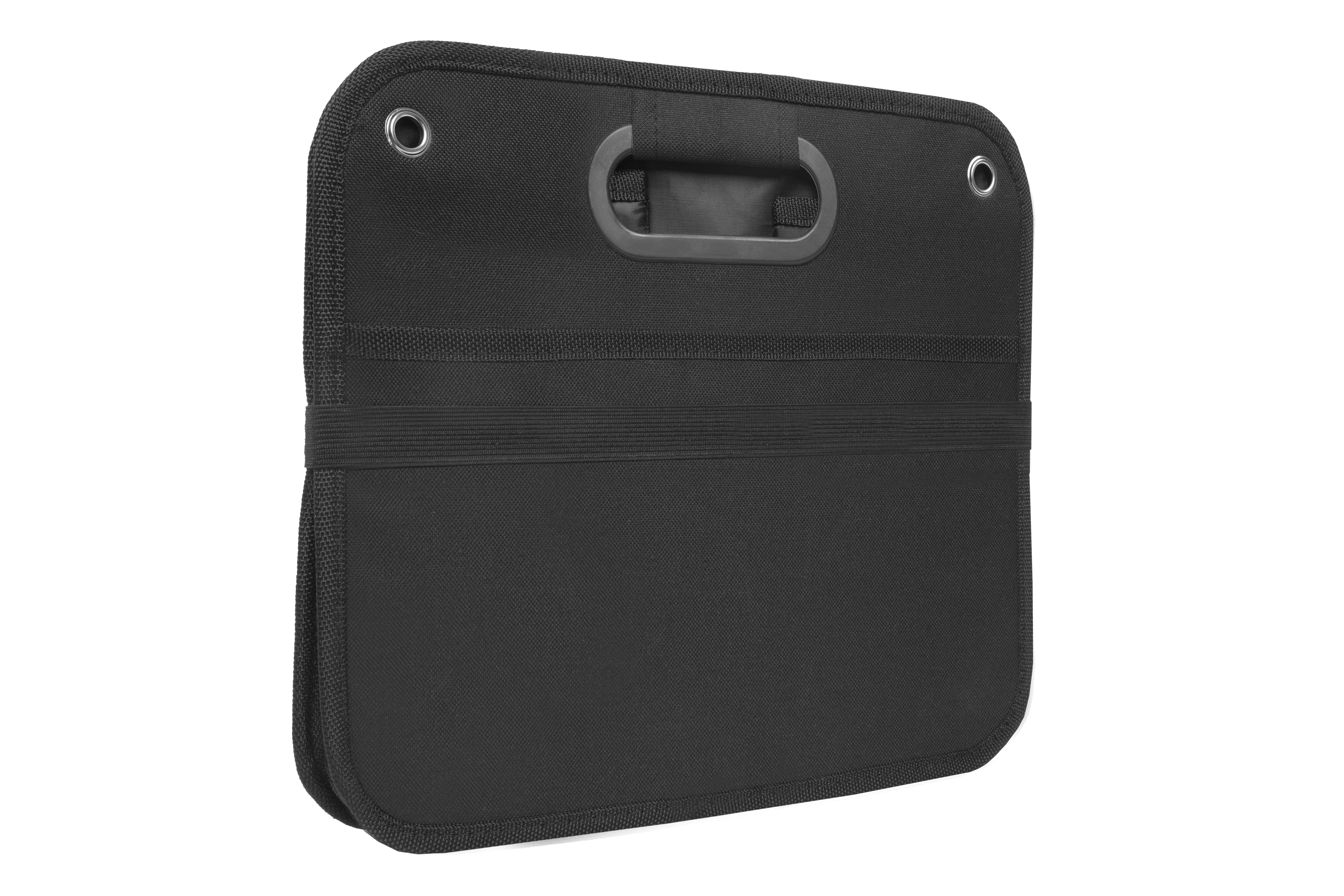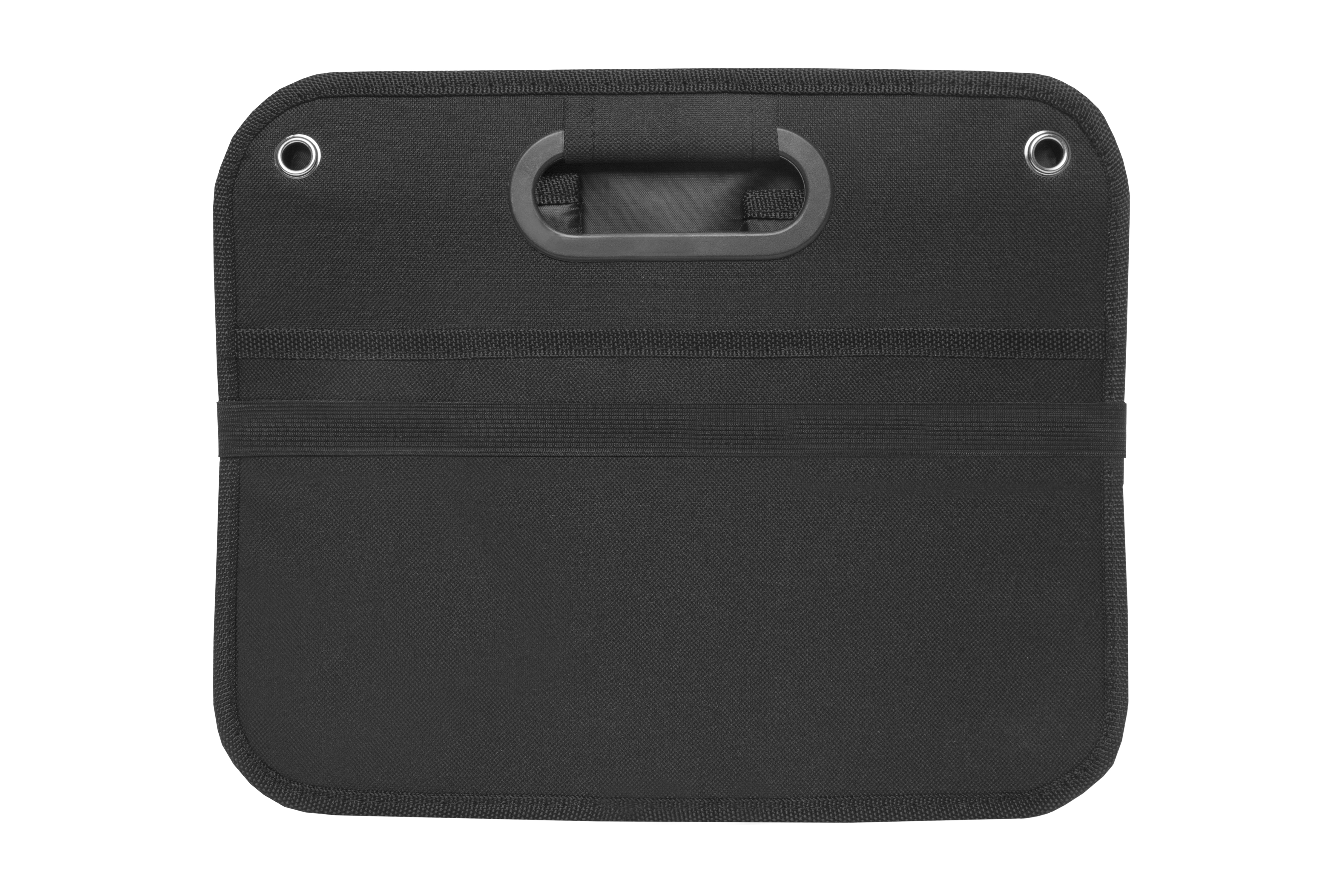 51 x 26,5 x 32,5 cm. (abierto). 5 x 26,5 x 32,5 cm (cerrado). Polyester 600D. Organizador. Dos amplios compartimentos de 25,5 cm (aprox) cada uno con dos estructuras de cartón que permiten armar los contenedores. Uno de los compartimentos tiene un bolsillo de red. Manijas recubiertas en plástico. Arandelas metálicas. En la parte inferior contiene velcro que se adhiere a la superficie. Banda elástica que mantiene cerrado el organizador cuando no esta en uso.