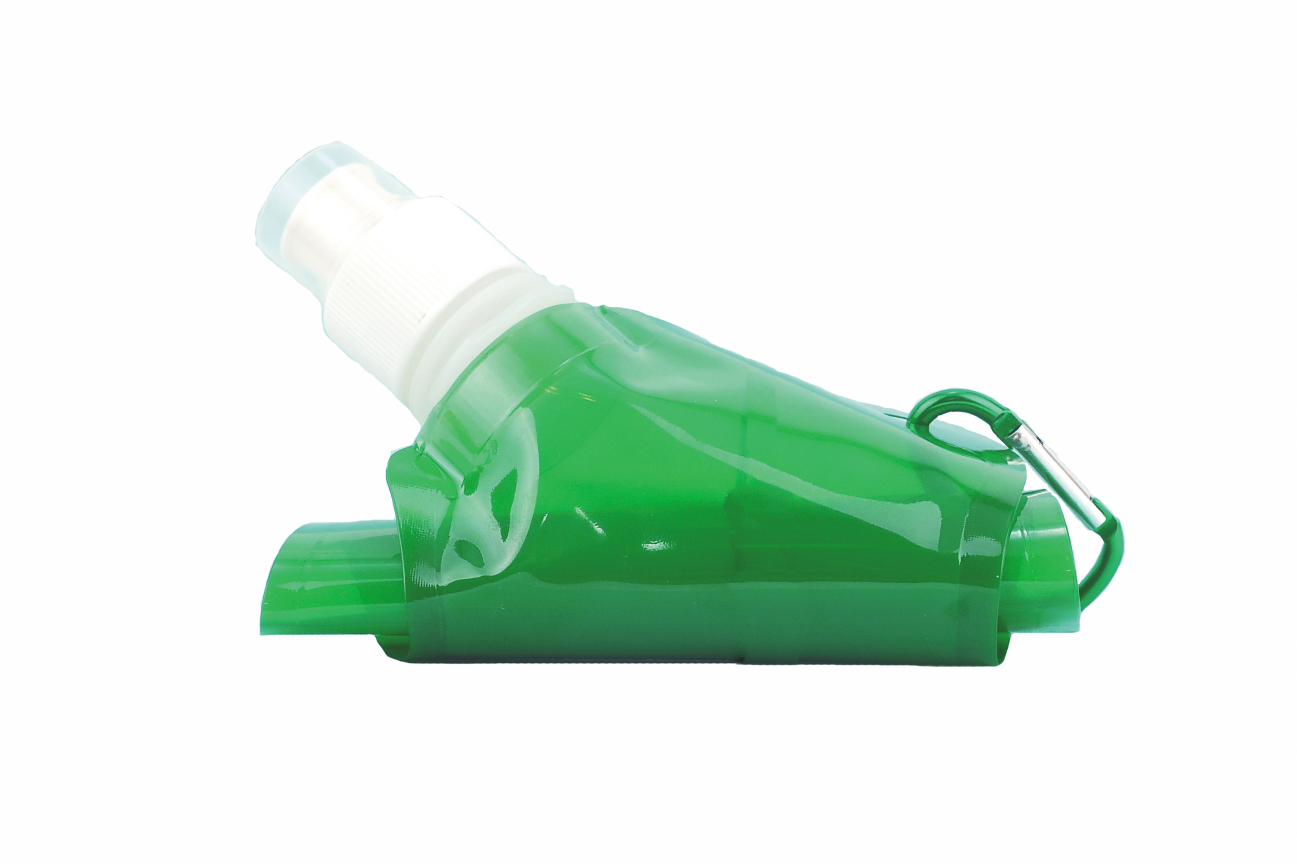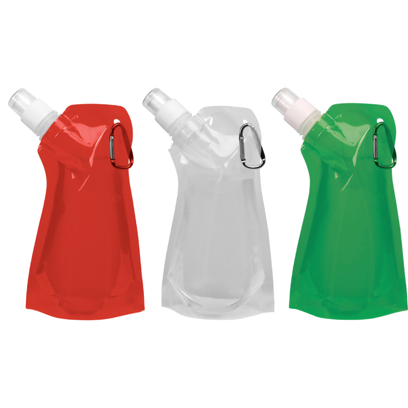 23 x 14 x 3,5 cm. capacidad 480 ml. Aprox. Plástico. Botella de agua con tapón y arnés para colgar. Vacía se puede enrollar para transportar.