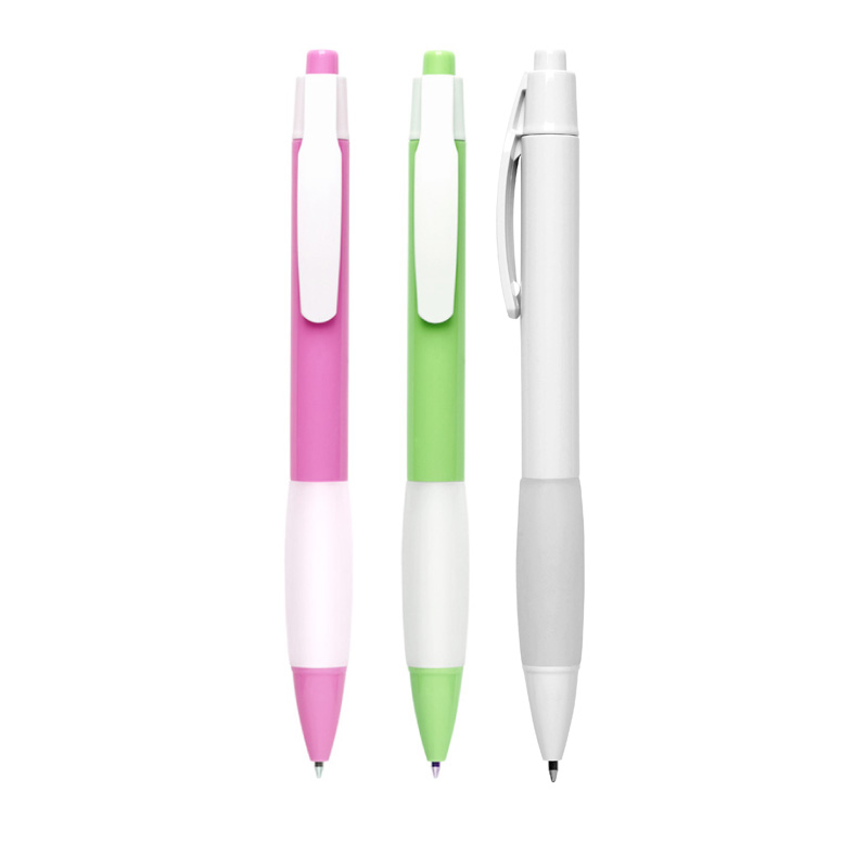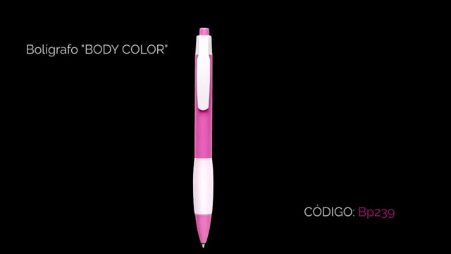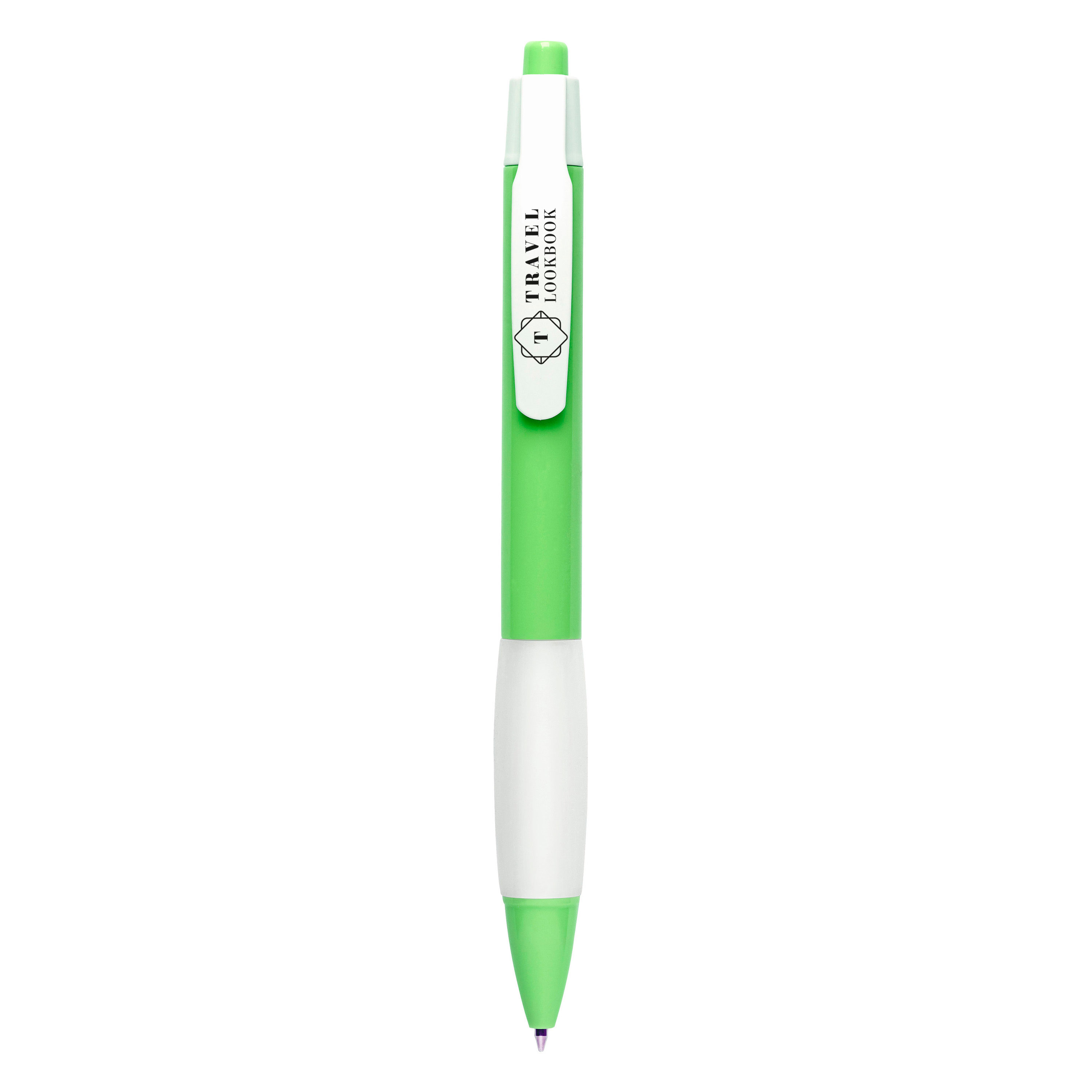 Bolígrafo con cuerpo plástico de color, clip color blanco y grip de goma transparente. Tinta negra.