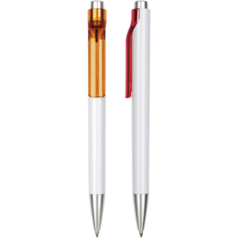 Plástico. Cuerpo blanco. Pulsador y puntera color plata. Clip con detalle de color transparente. Tinta negra.