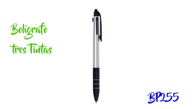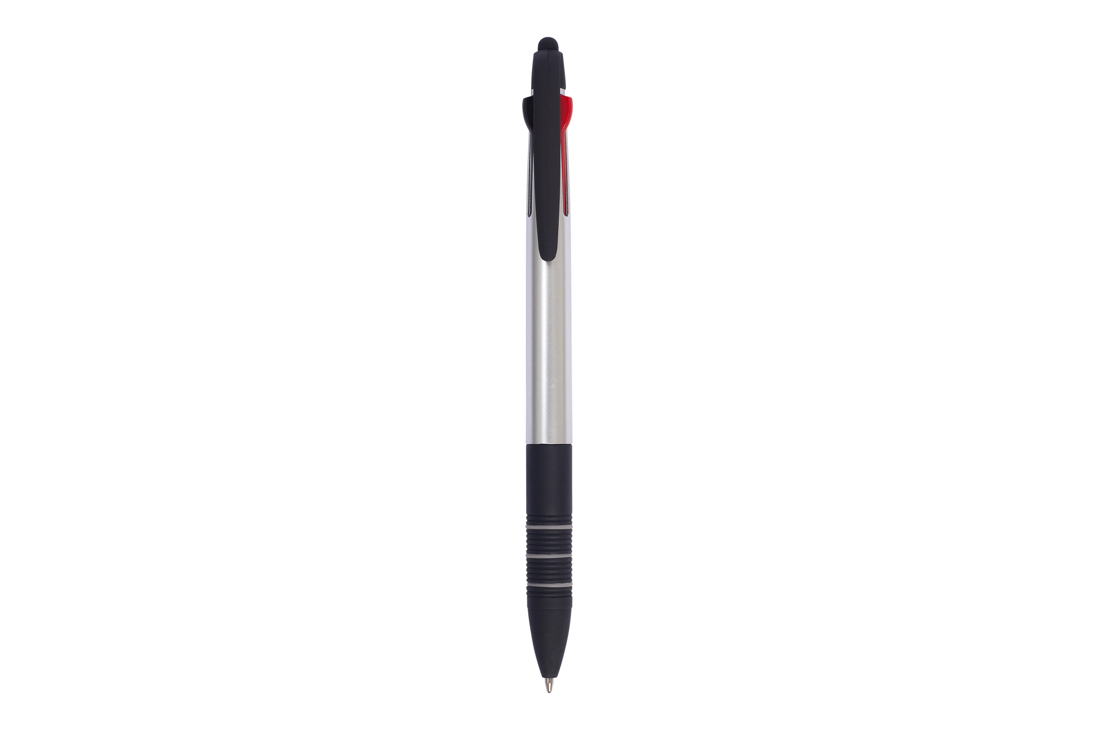 Plástico. Cuerpo plateado. En la parte superior touch negro, clip y puntera del mismo color. Tinta azul-roja-negra.