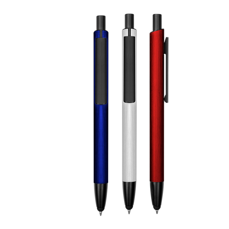 Aluminio. Cuerpo metálico. Clip, punta y pulsador plásticos. Punta touch. Tinta negra.