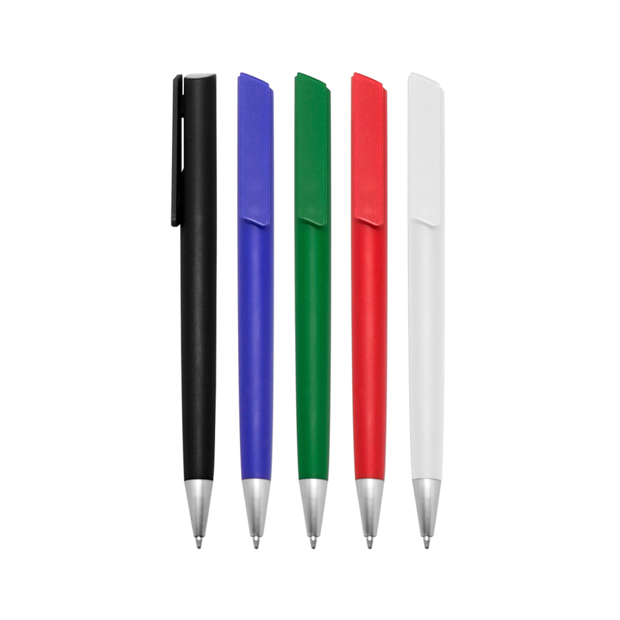 Plástico. Cuerpo de color. Clip pulsador y punta color plata. Tinta negra