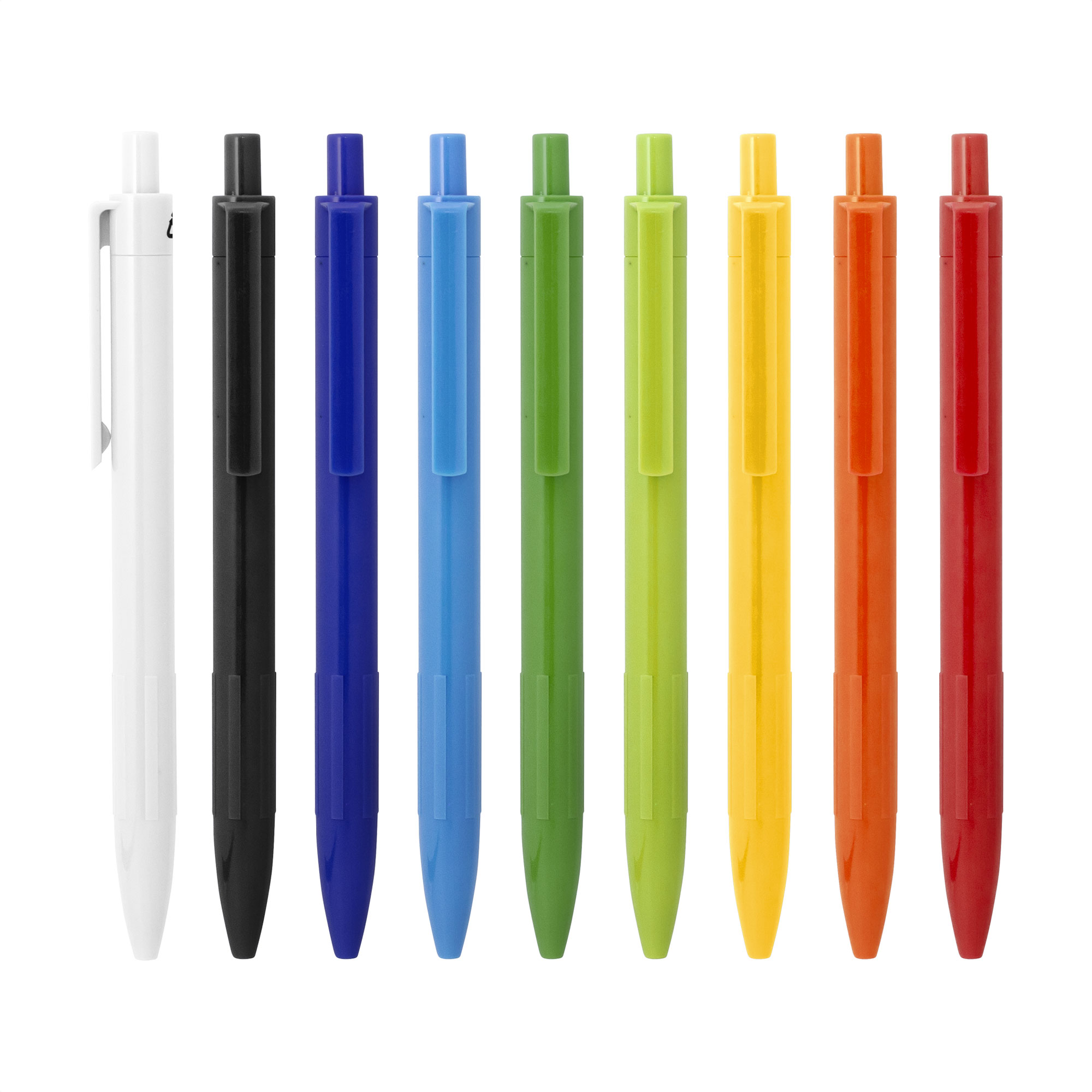 Bolígrafo retráctil. Cuerpo de diferentes colores. Acabado mate. Pulsador, clip y puntera del mismo color del cuerpo.