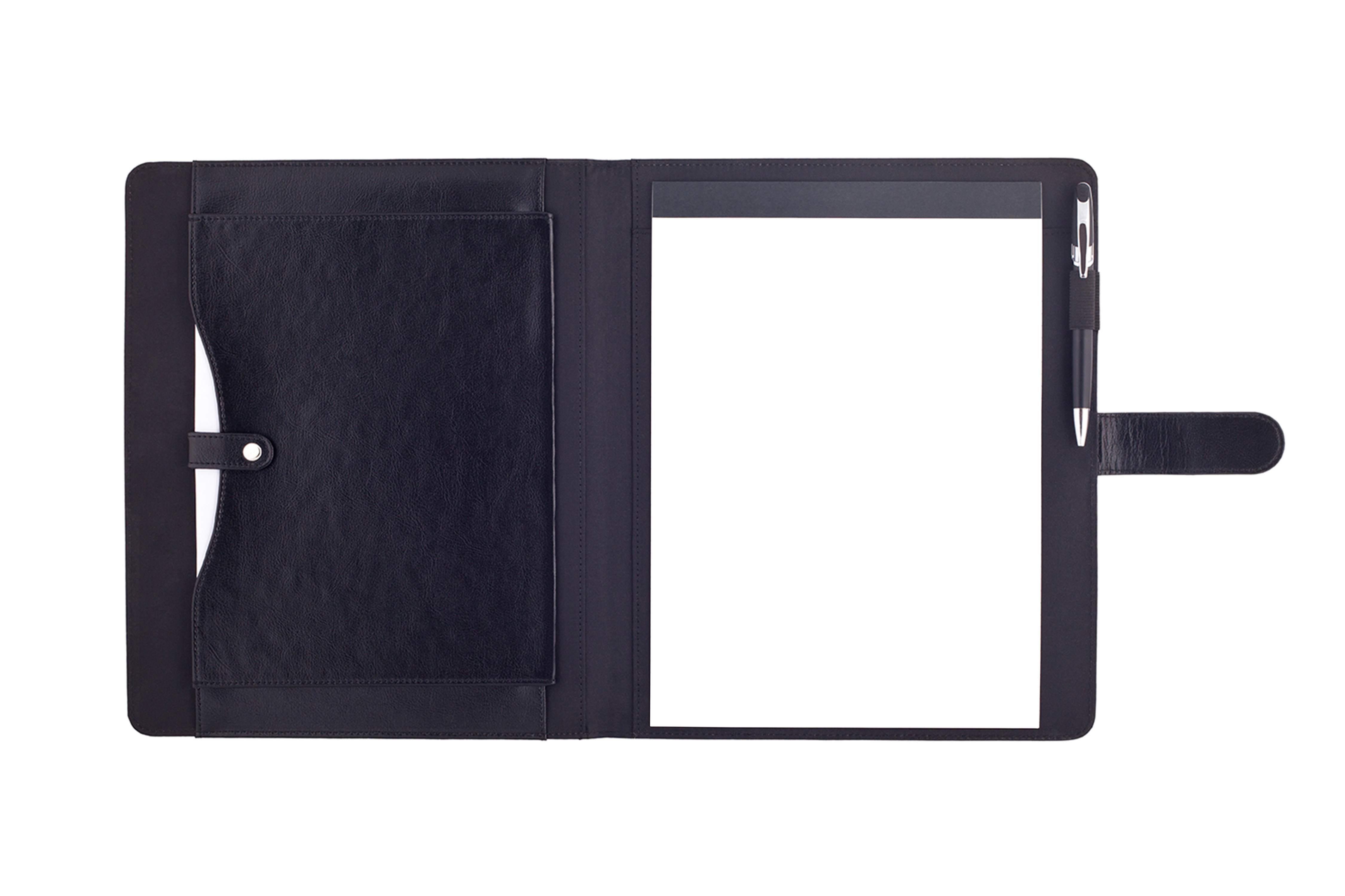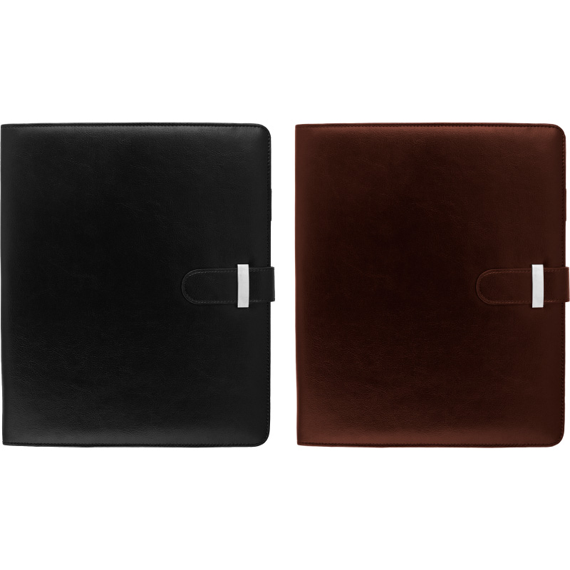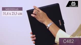 52,4 x 31,4 x 25,5 cm. Exterior Símil Cuero acojinado. Interior con compartimento. Bloc A4 hojas rayadas. Traba Metálica