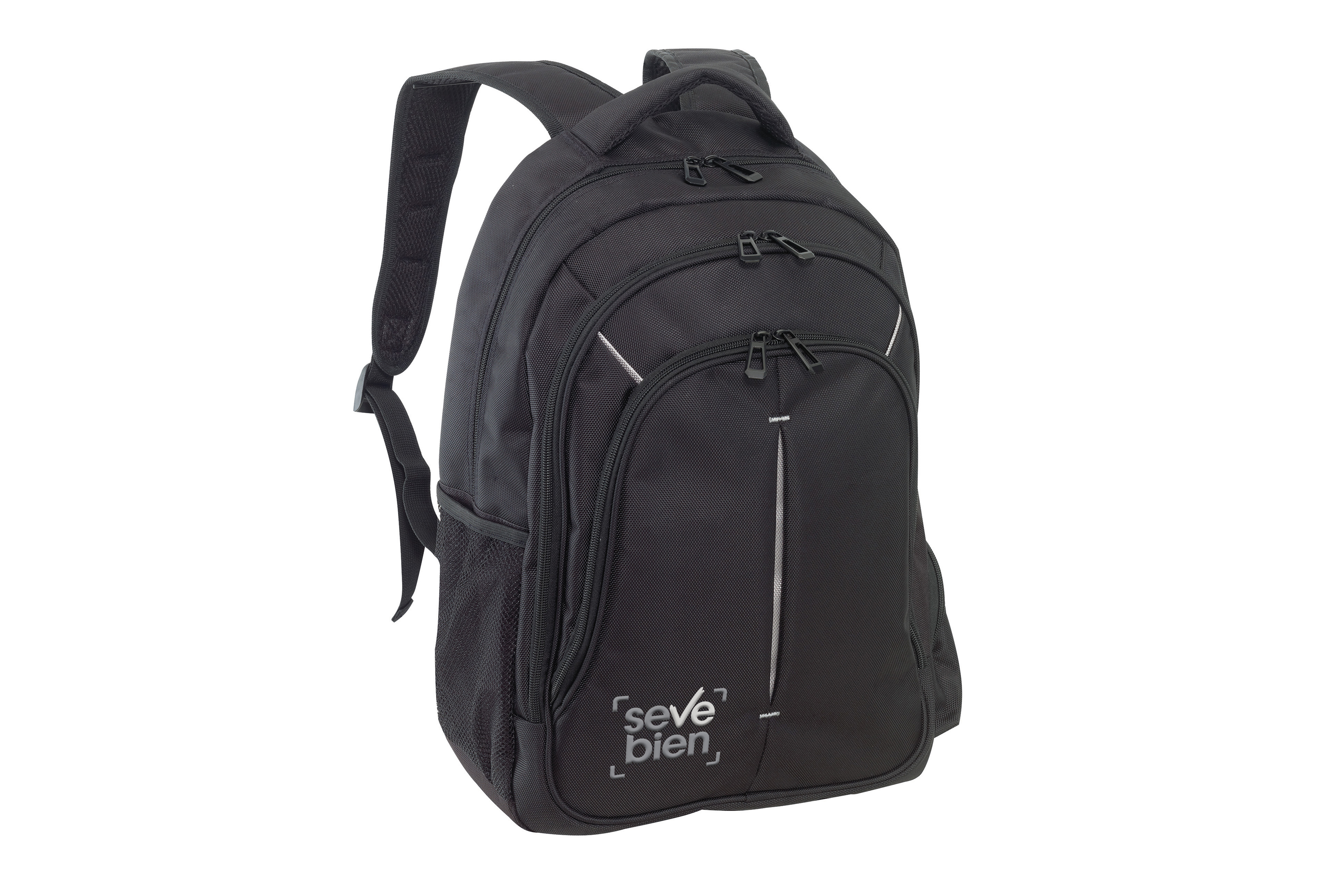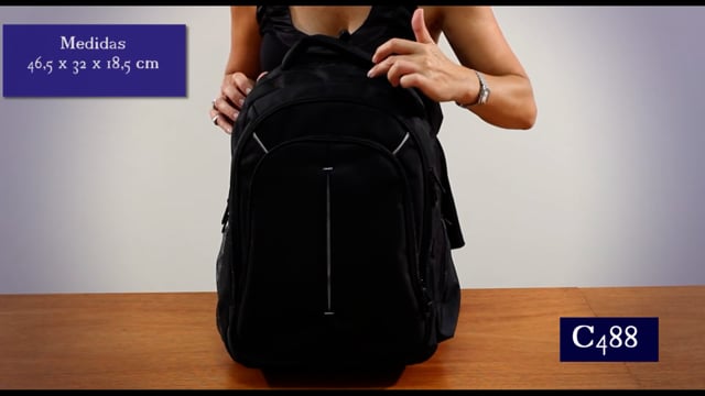 46,5 x 32 x 18,5 cm. Capacidad 27 litros. Poliéster 600D. Mochila portanotebook de hasta 16". Dos bolsillos frontales con cierre. Bolsillo de red lateral porta bebidas. Compartimento principal acojinado con cierre. Correas ajustables y espalda acojinadas. Cierres metálicos.