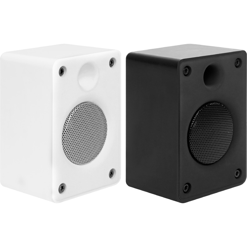 9 x 6 x 4,6 cm. Plástico. Bocina Bluetooth. En la parte interna engomado. Se puede conectar por bluetooth y cable mini USB.