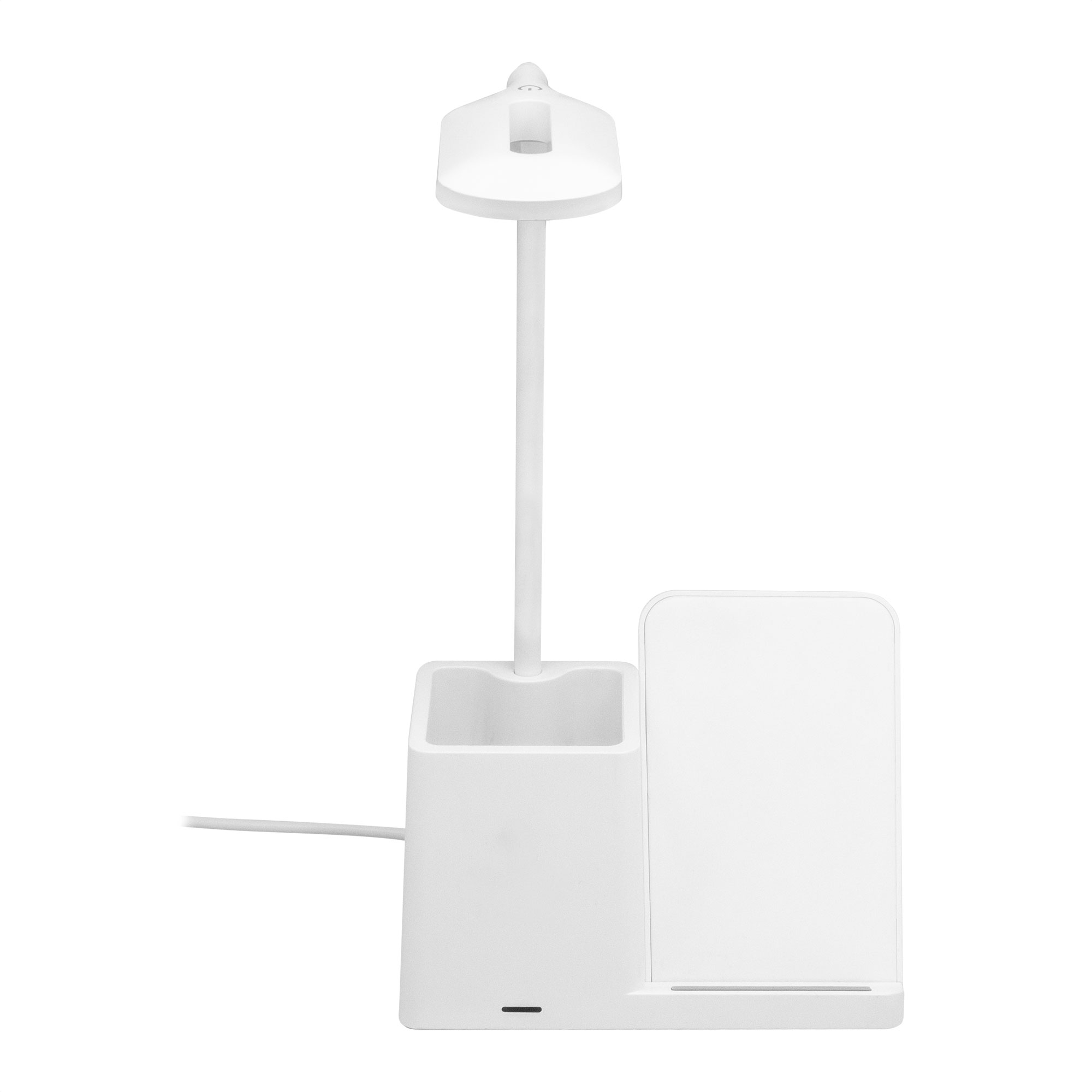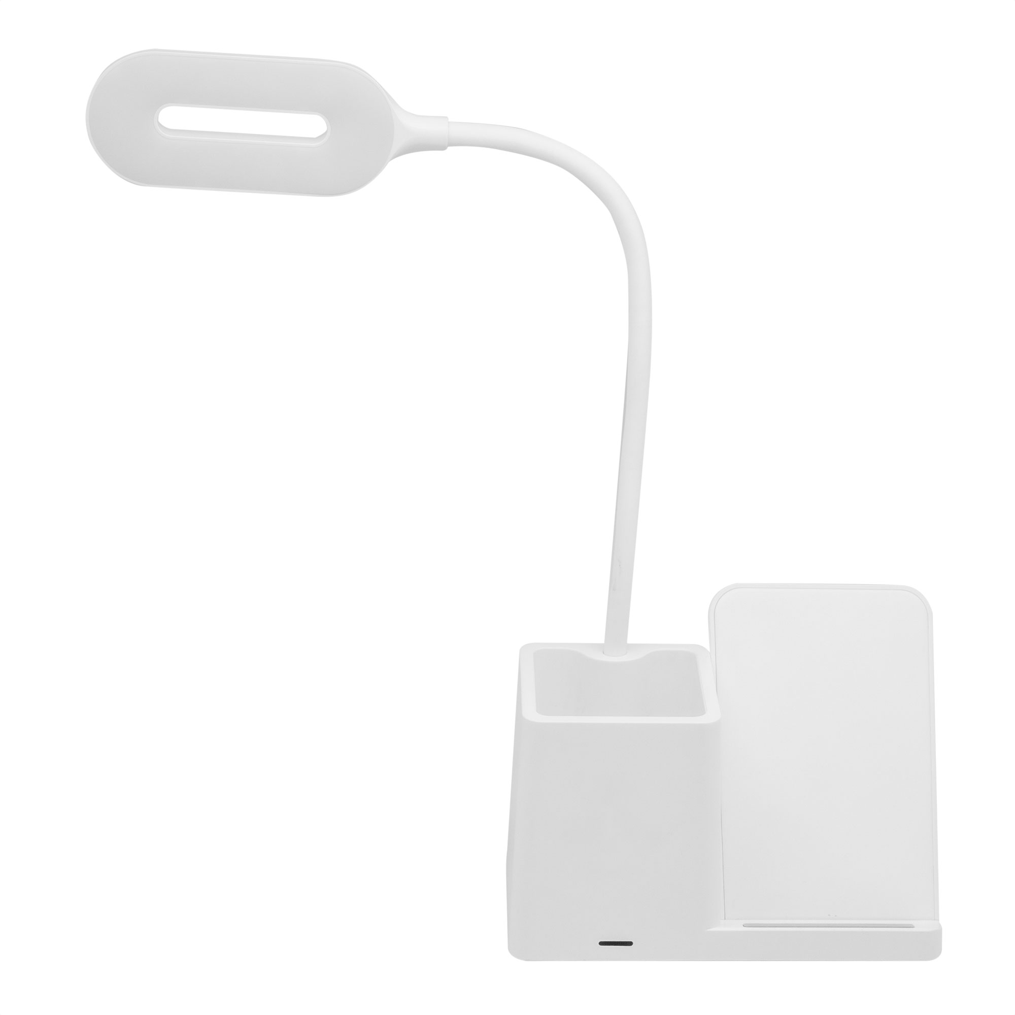Lámpara de escritorio con portabolígrafos y cargador inalámbrico para teléfono móvil. Posee 3 modos de luz: cálida, fría y tenue. Cuello flexible. Carga rápida inalámbrica de 15w. Conector tipo USB-C.