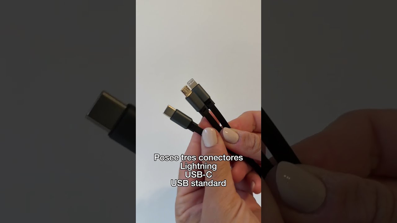 Cable de carga retráctil con longitud de hasta 115 cm. 3 en 1. Posee tres conectores (Lightning, USB-C y USB standard).