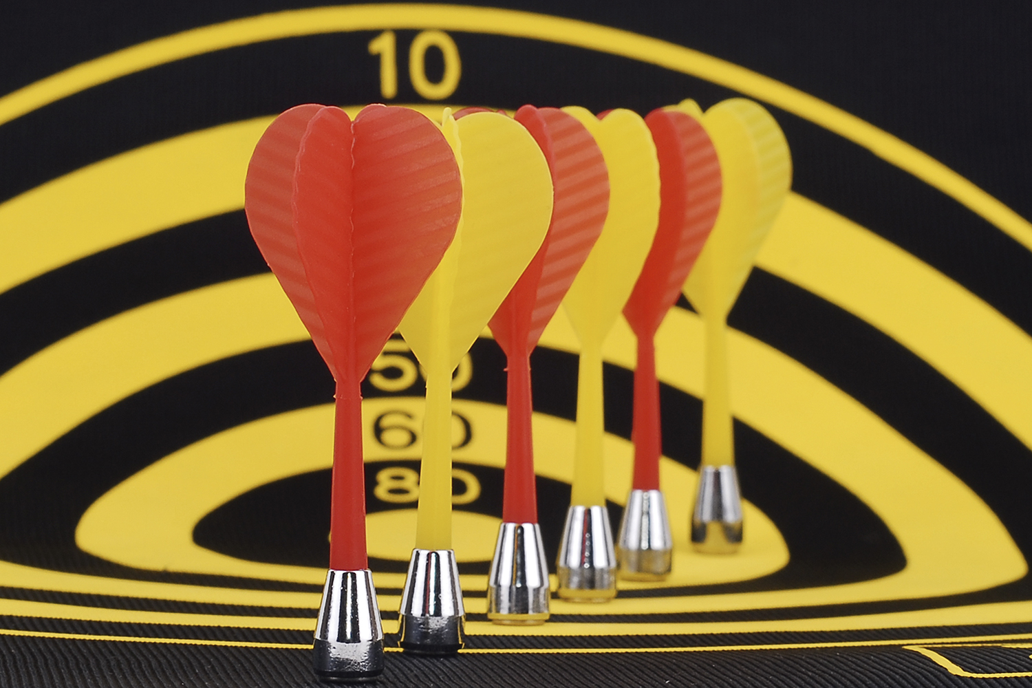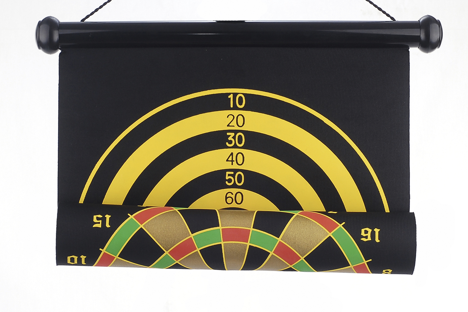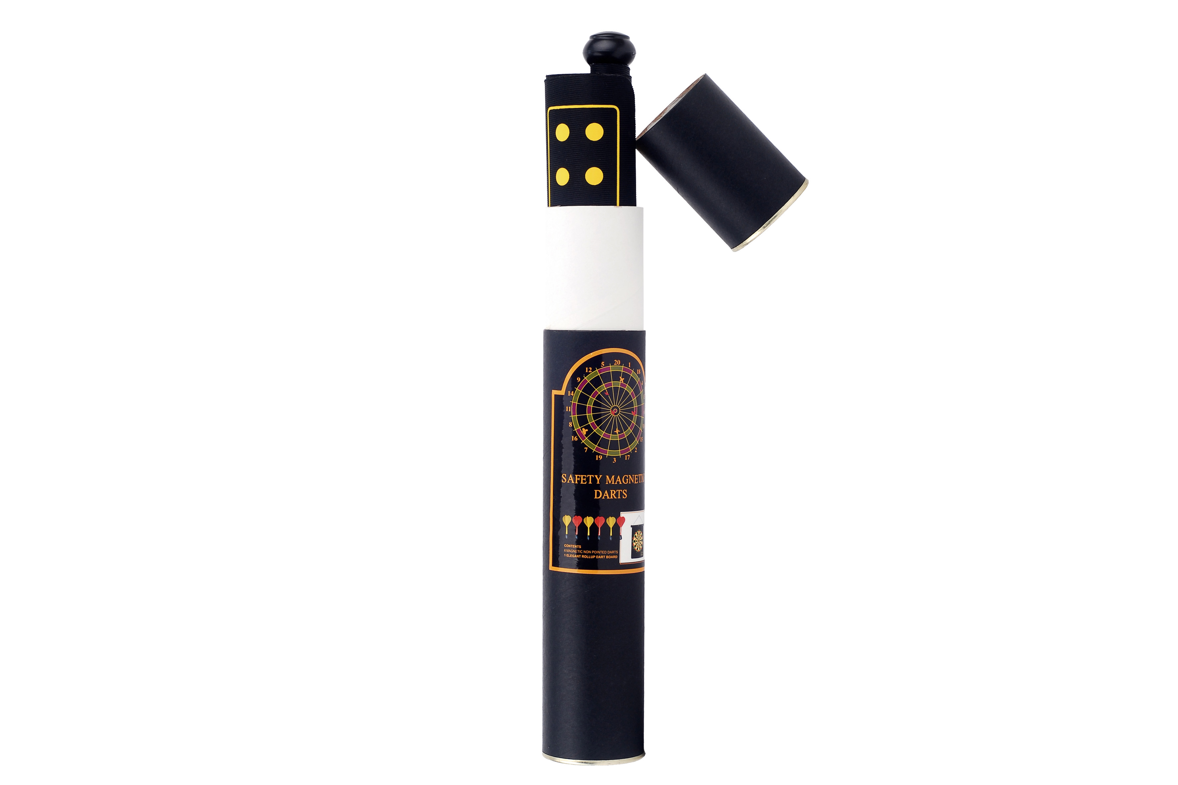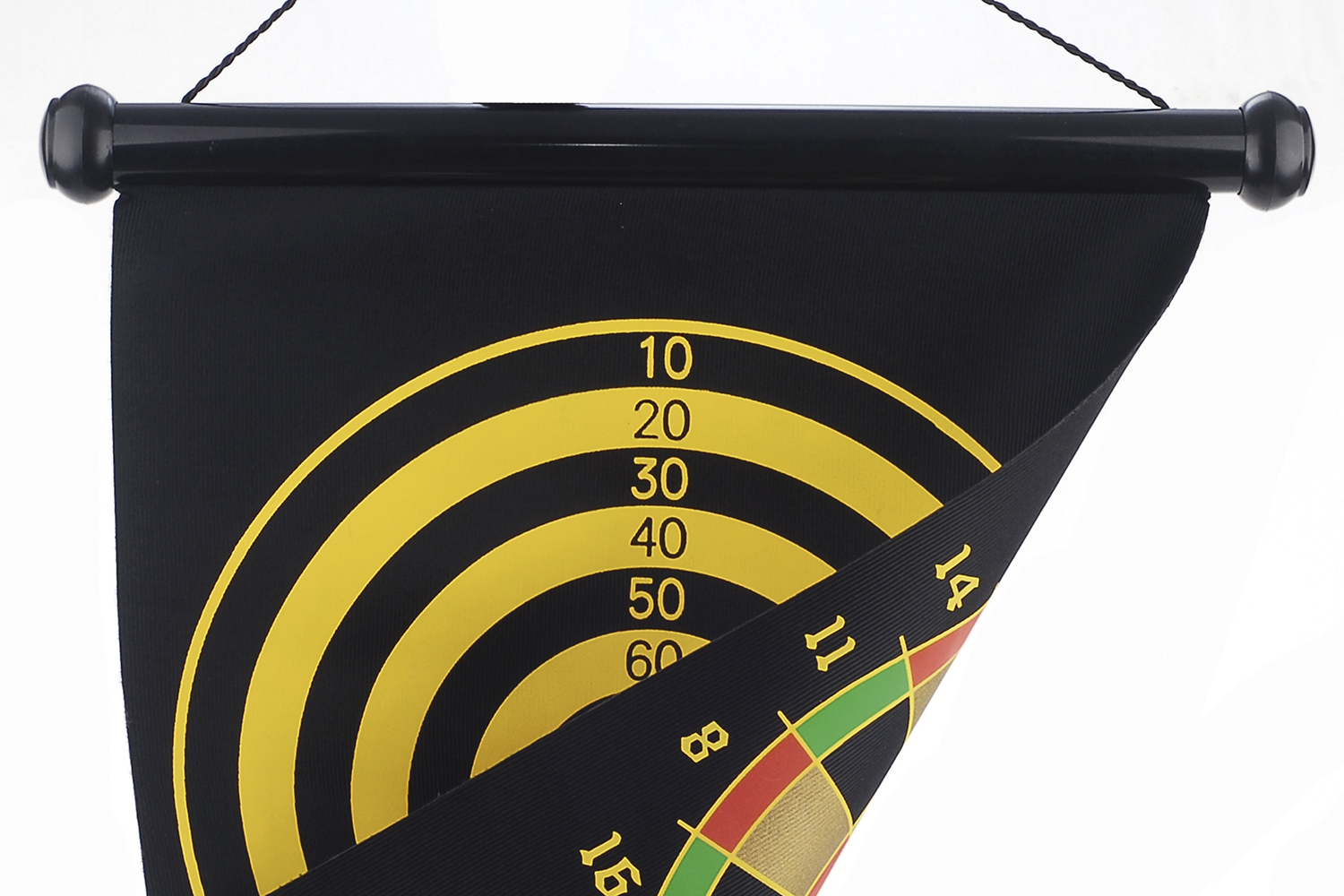 44 x 35,7 cm. Diana magnética enrollable, doble cara, incluye 6 dardos de plástico con punta imantada. Estuche cilíndrico en cartón sólido.
