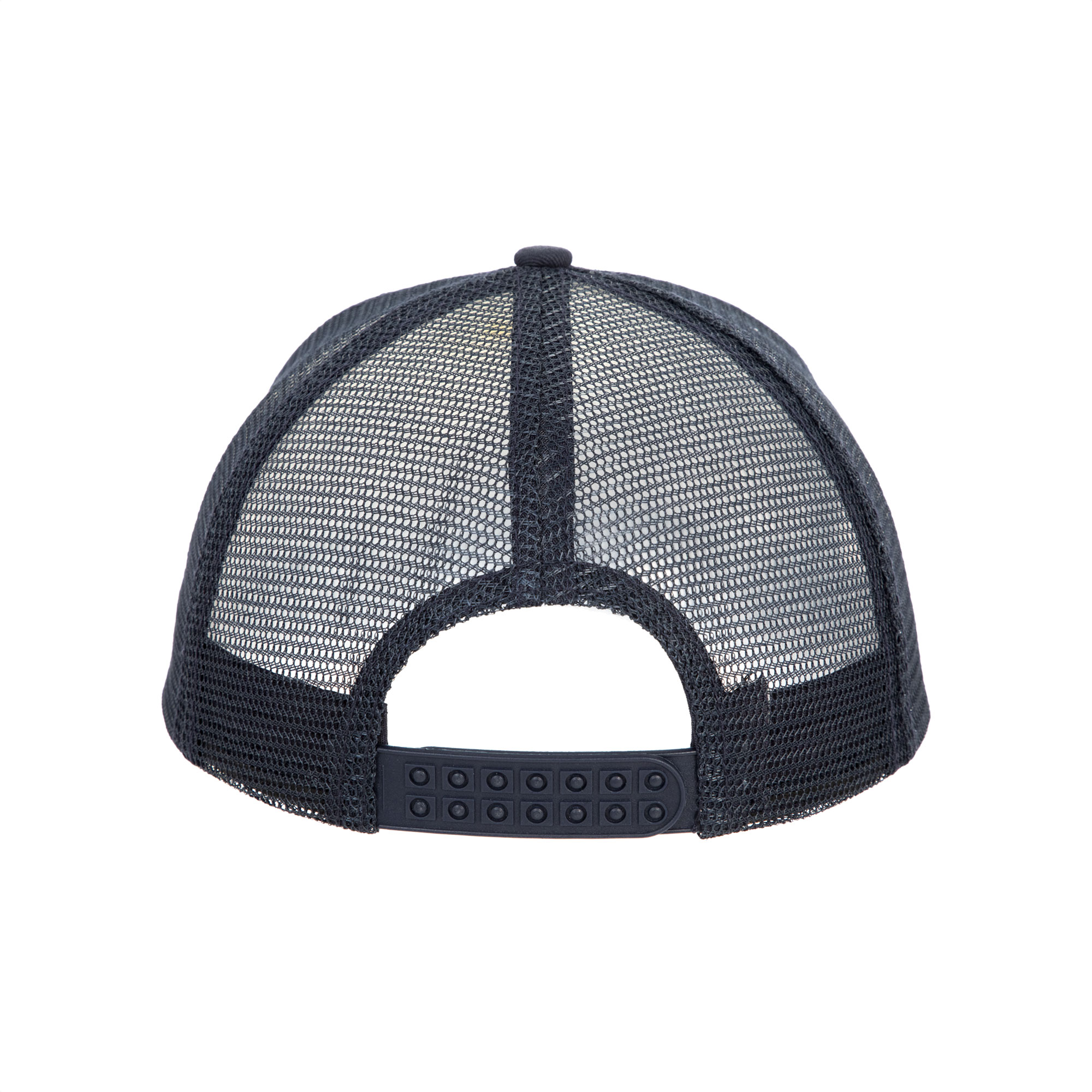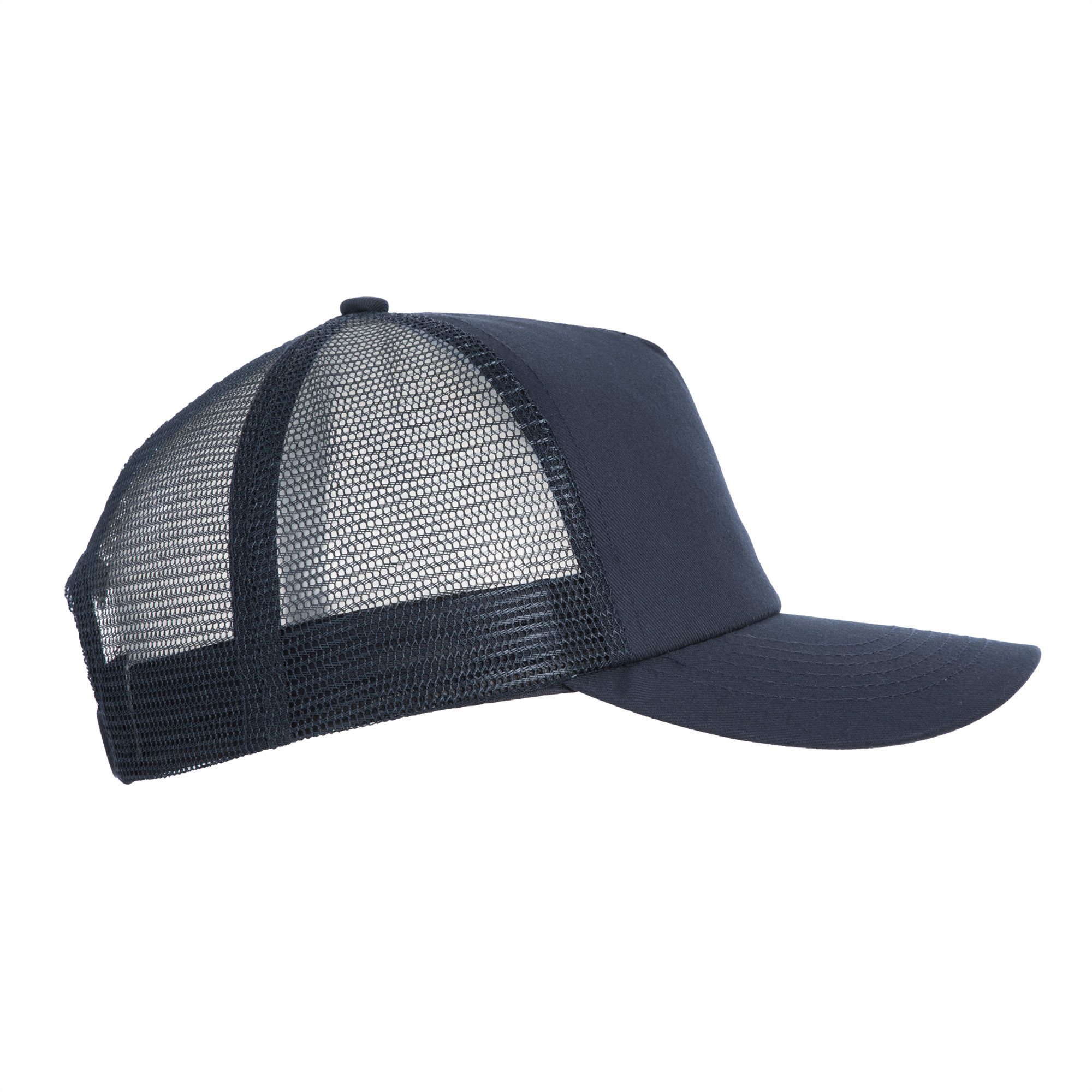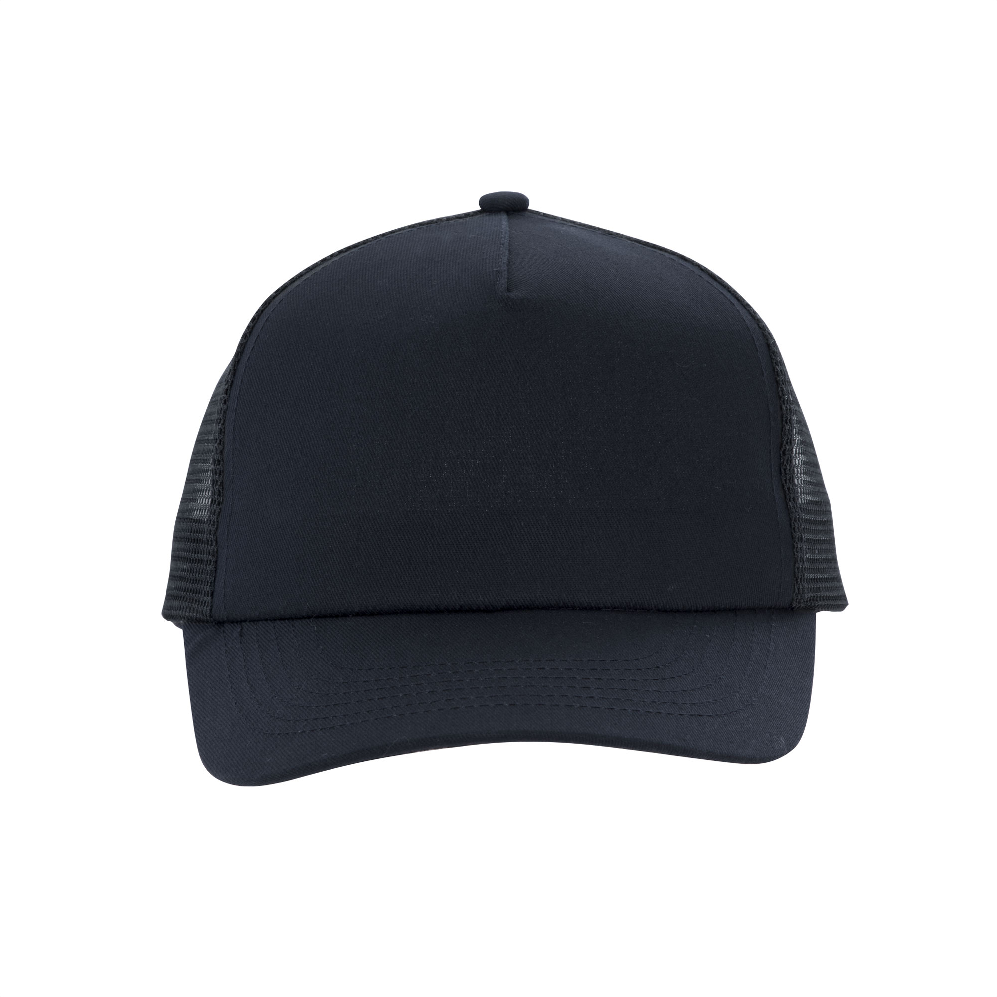 Gorra con visera. 5 gajos. Gajo frontal y visera de algodón. Gajos posteriores de malla poliéster del mismo color. Botón forrado. Banda absorbente de poliéster. Cierre con broche plástico ajustable de doble cremallera del mismo color.