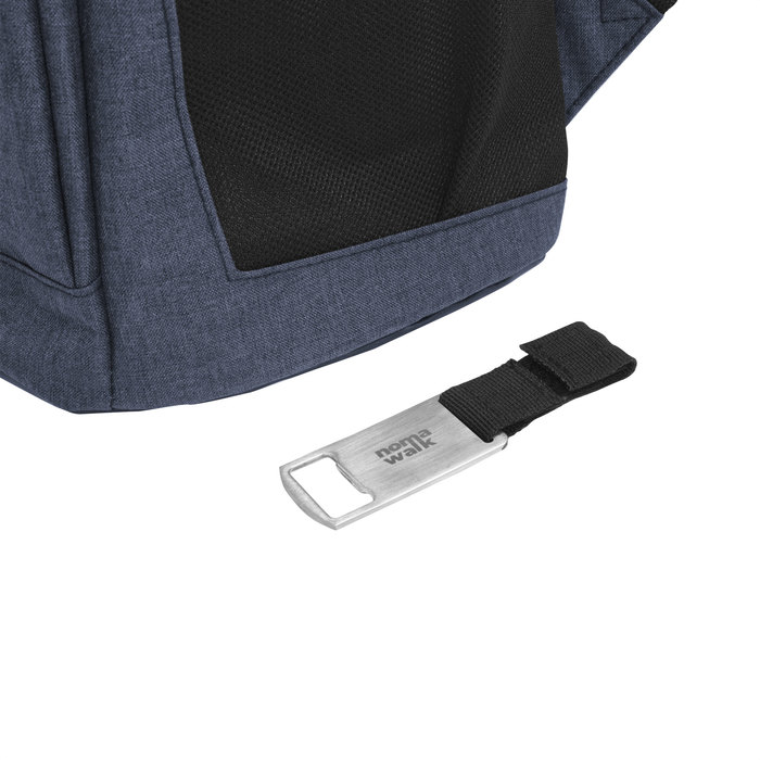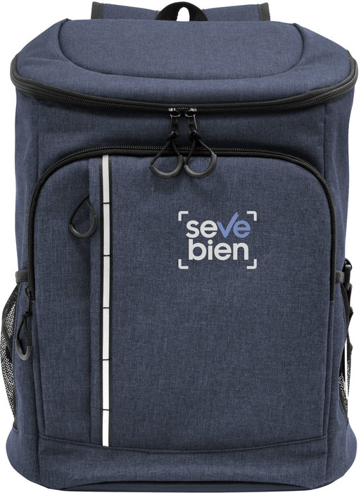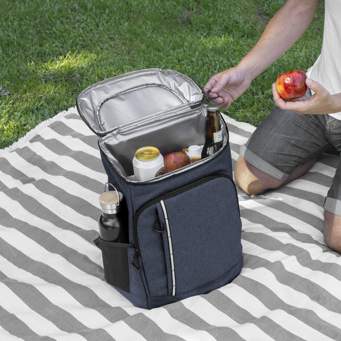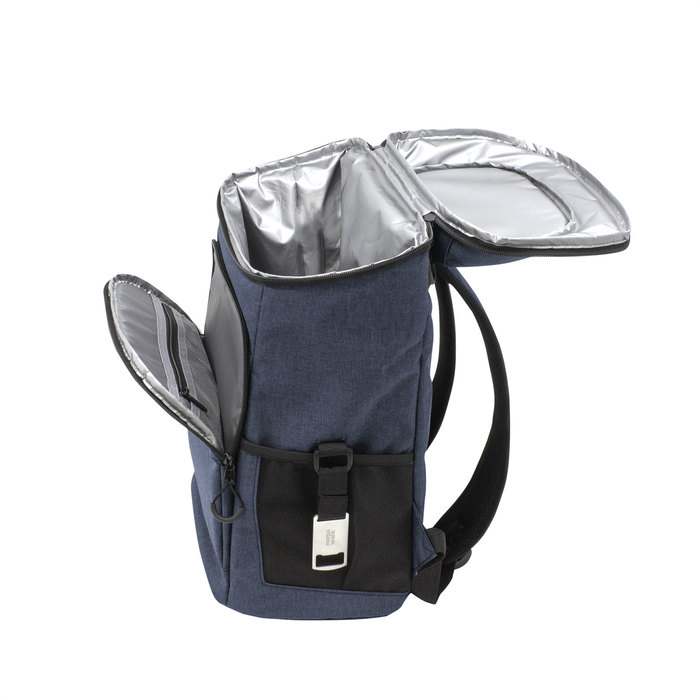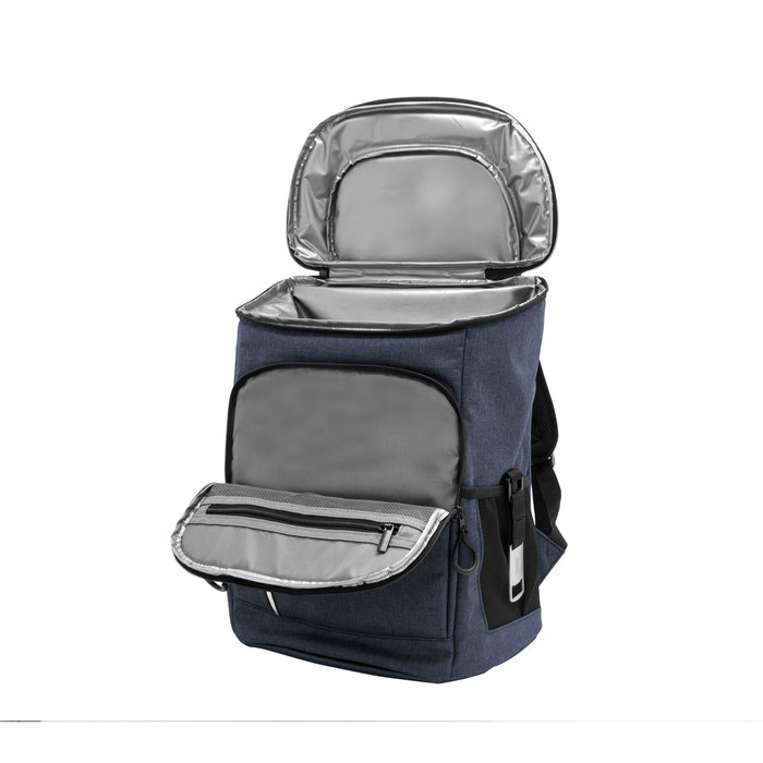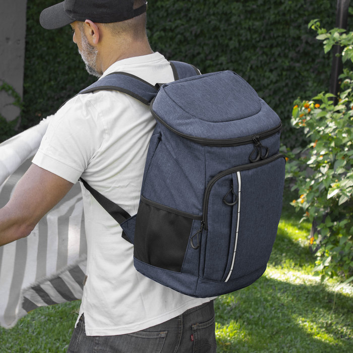 29 x 43 x 18 cm. Capacidad 18 litros aprox. Poliéster Wulong 300D + Interior forrado en PEVA color plata con relleno de espuma de PE. Mochila cooler. Compartimento principal con cierre en la parte superior. Compartimento frontal con cierre, bolsillo interno de red con cierre y bolsillo externo vertical con cierre y banda reflectante. Dos bolsillos laterales de red multipropósito. Incluye destapador de botellas de acero inoxidable (6,3 x 3,3 cm) extraíble. Correas regulables acolchadas. Cierres metálicos. Tiradores de cierre plásticos en forma de U de color negro.
