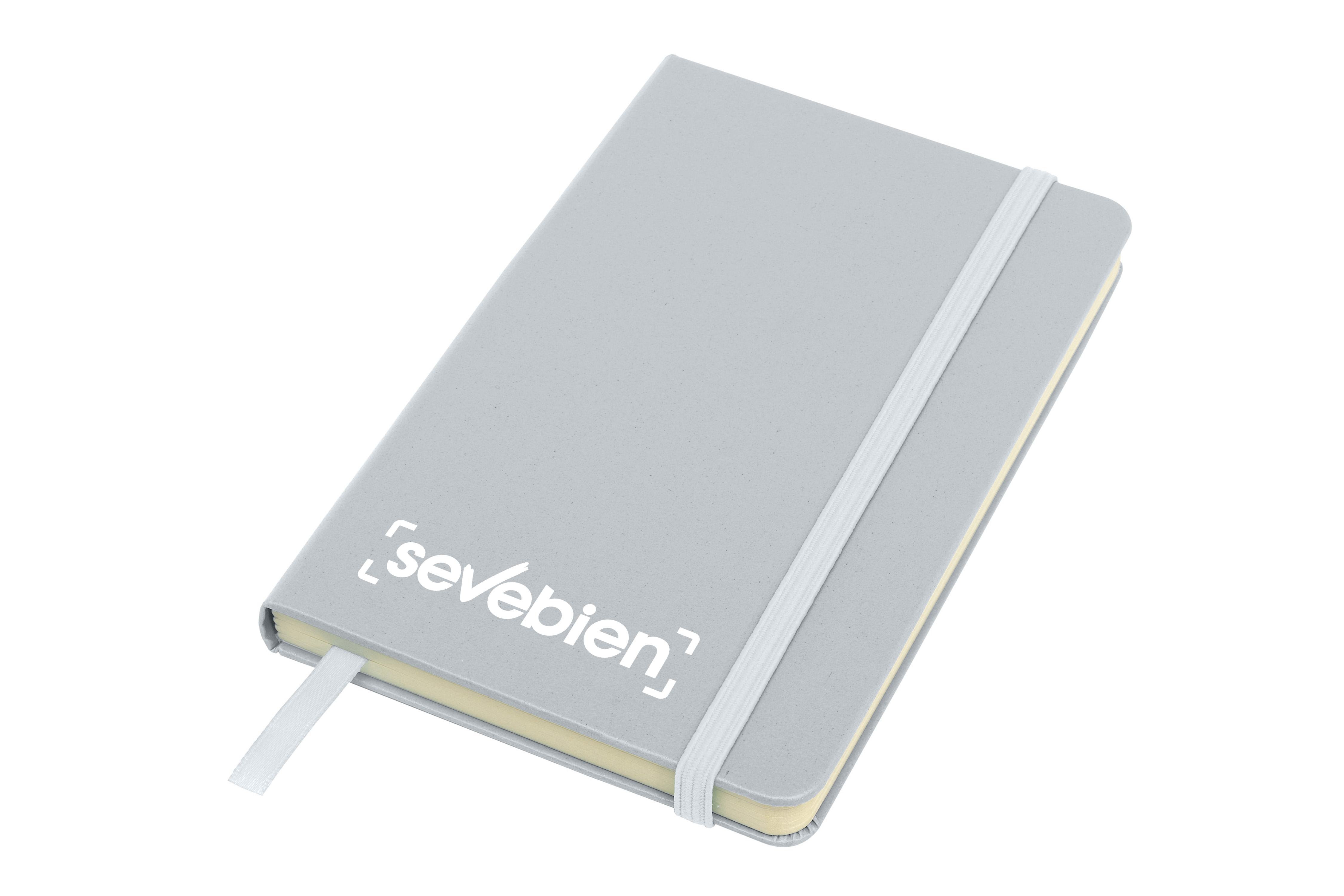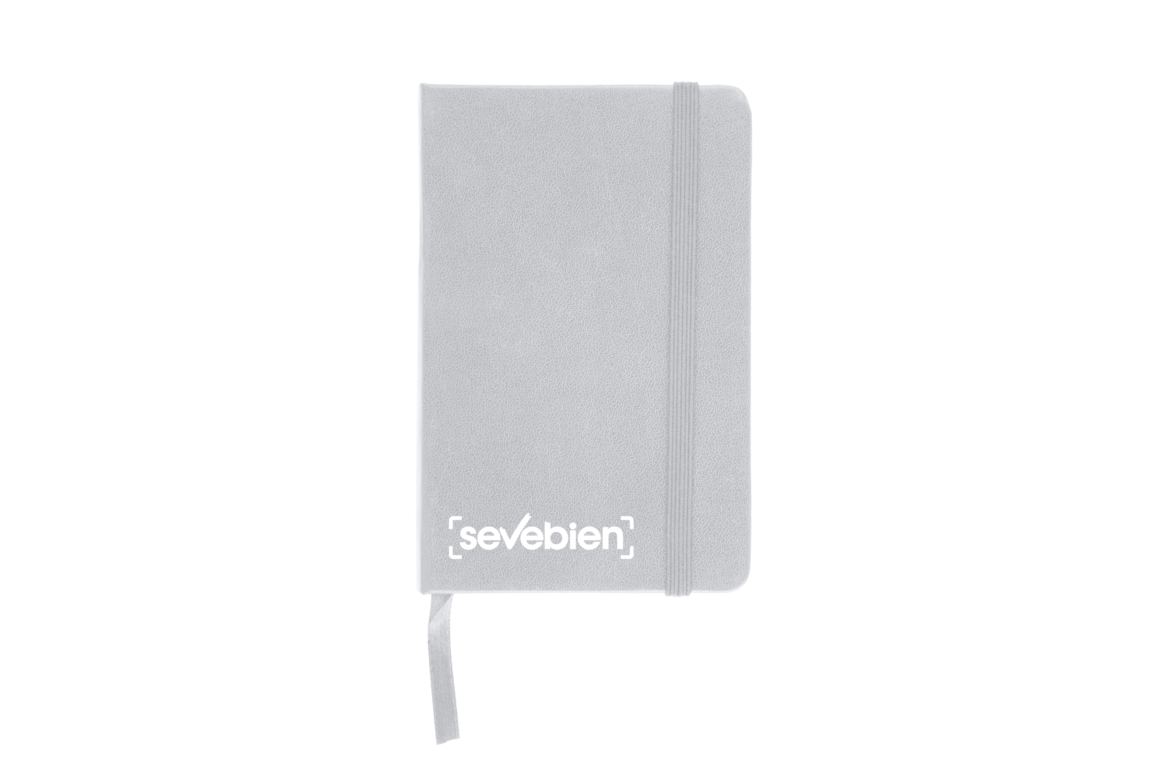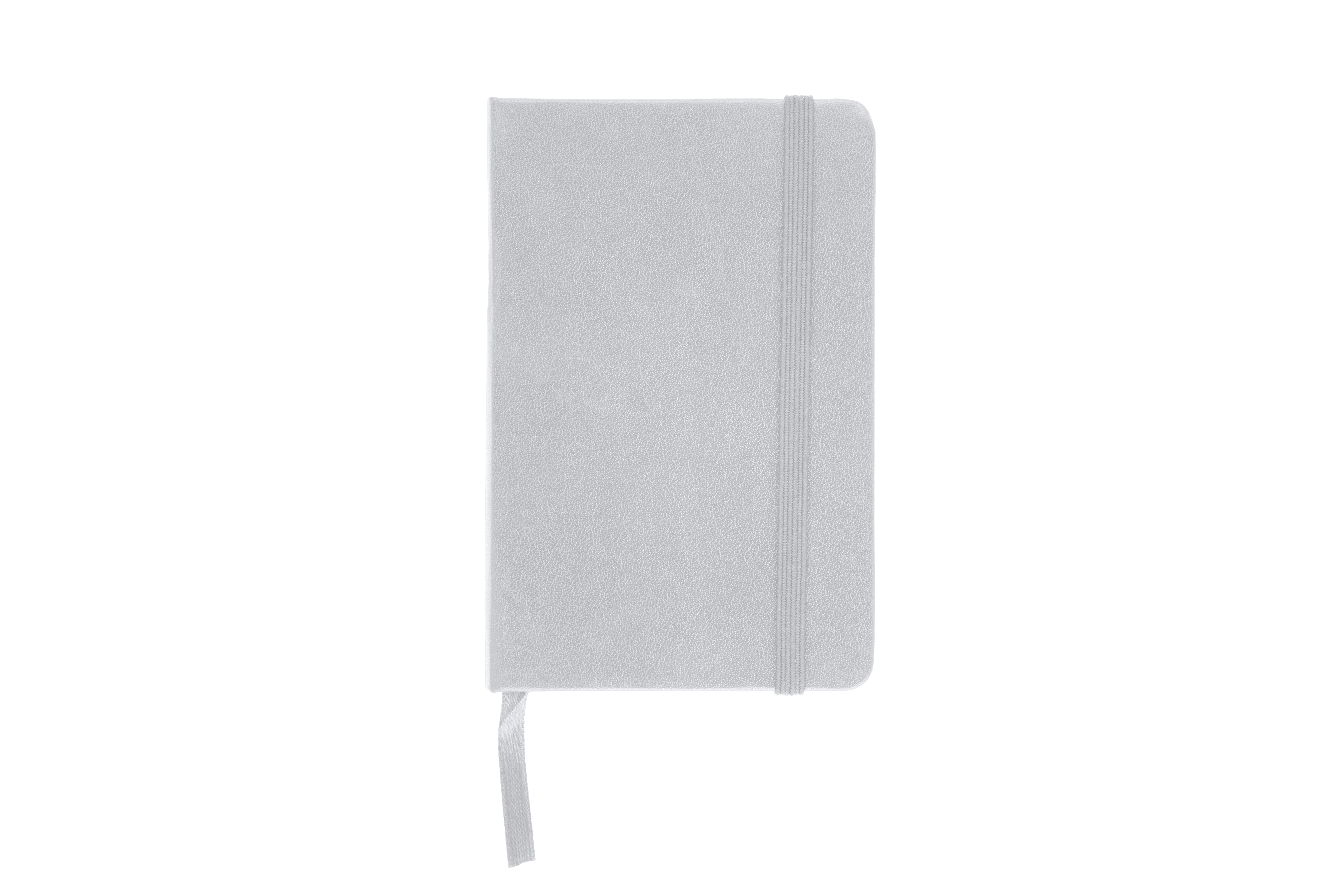 14 x 9 x 1,5 cm Cartón. 80 páginas rayadas. Separador de hojas en tela. Cierre con banda elástica.