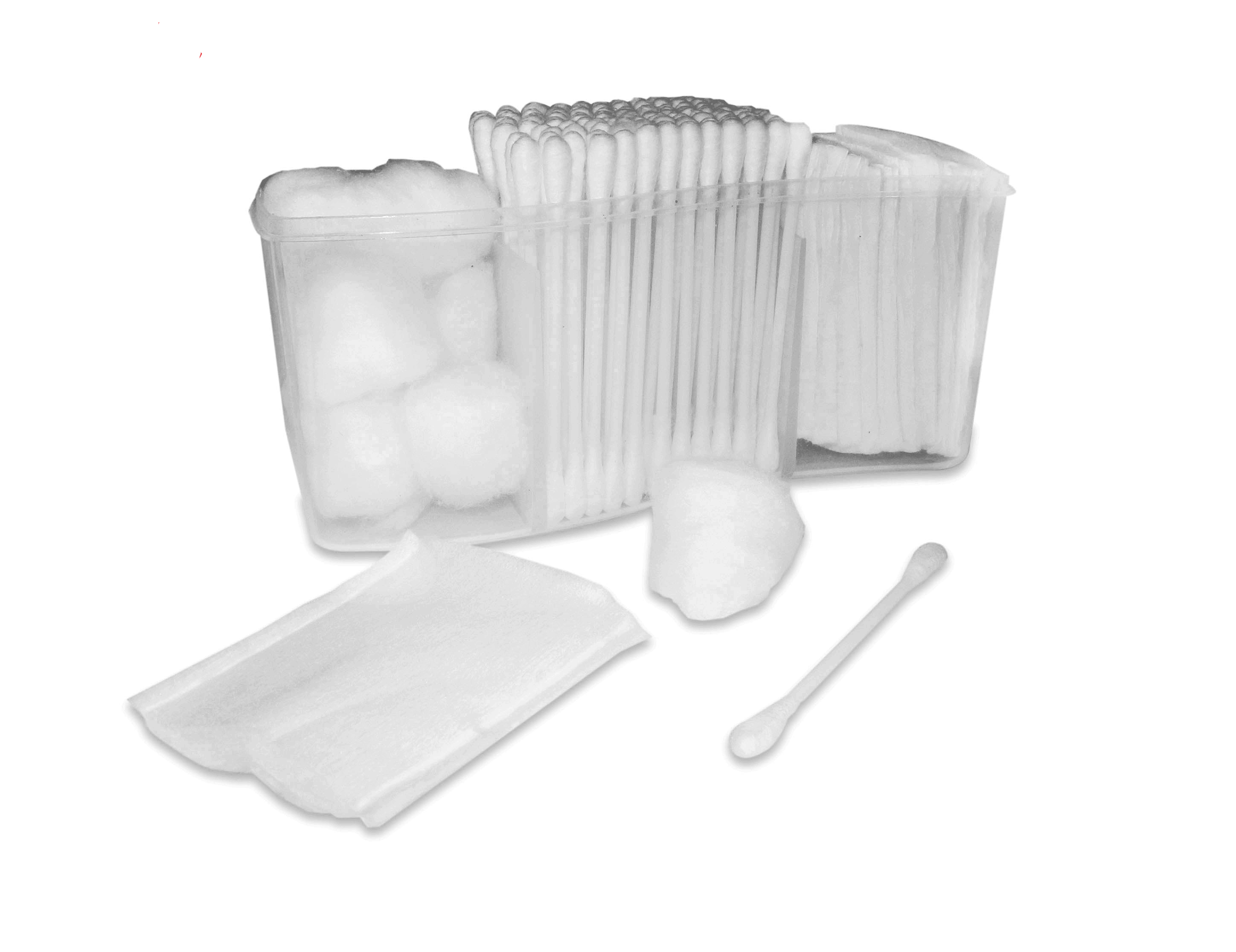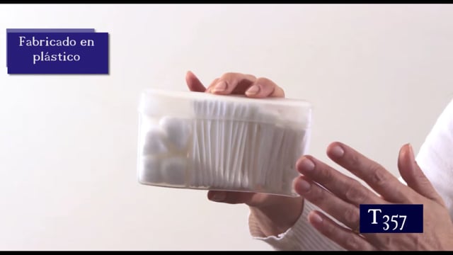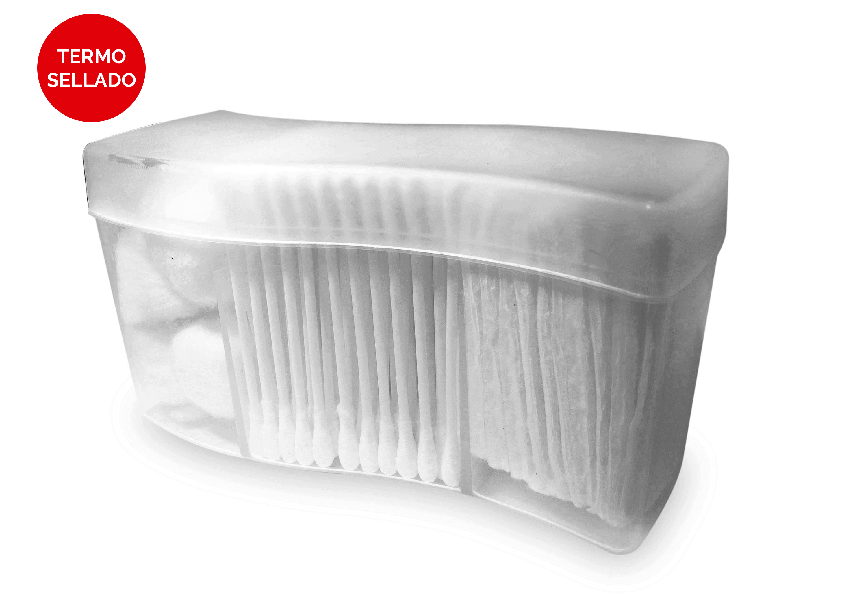 14,3 x 4,9 x 8 cm. Plástico. Set para cuidado personal: Cotonetes, algodoncitos y Toallitas de algodón. Con termo sellado de seguridad para proteger el contenido.