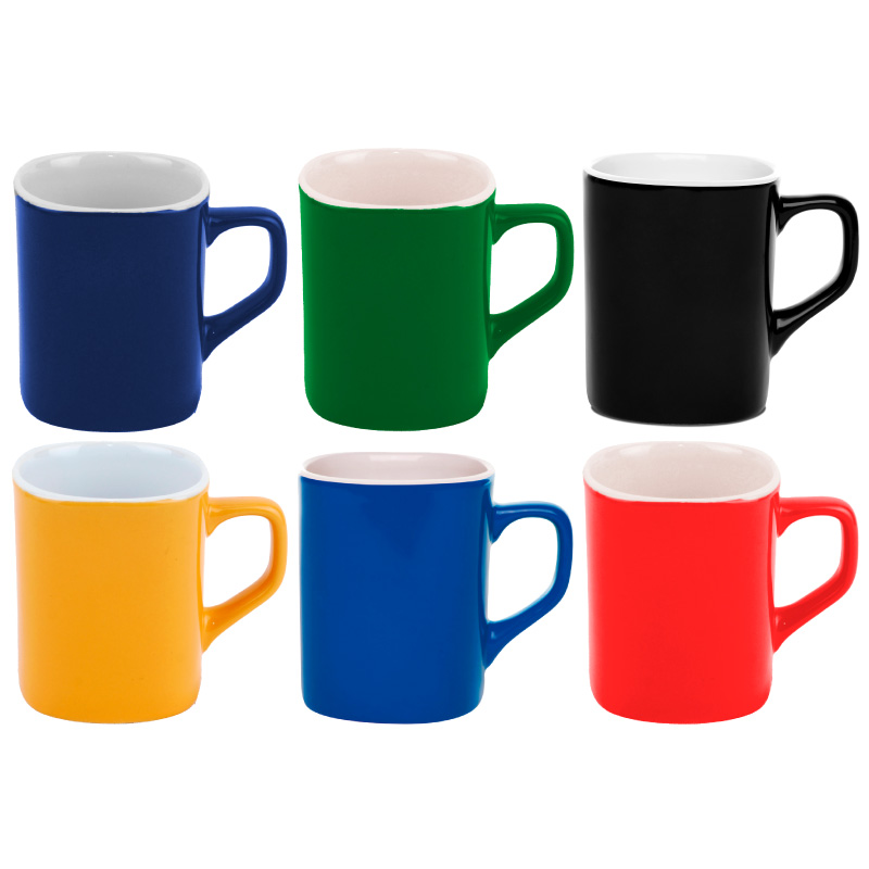 7,3 x 8,9 cm. Capacidad: 230 ml aprox. Cerámica. Taza cuadrada. Interior blanco y exterior de color. Con asa.
