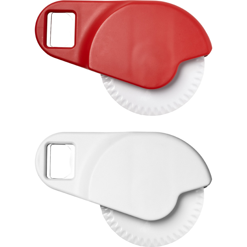 12 x 8 x 2 cm. Plástico. Cortador de pizza con destapador de botella.