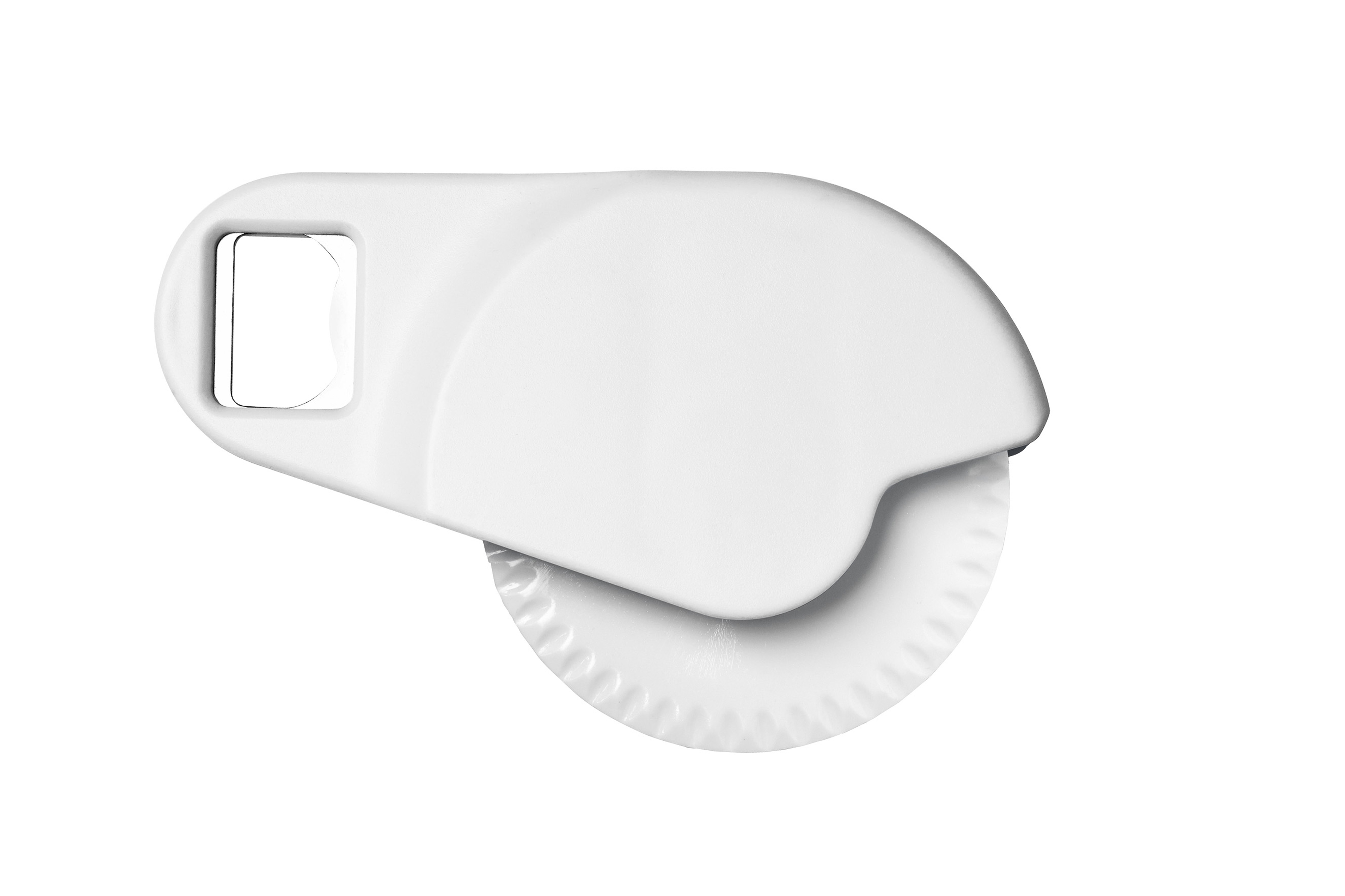 12 x 8 x 2 cm. Plástico. Cortador de pizza con destapador de botella.
