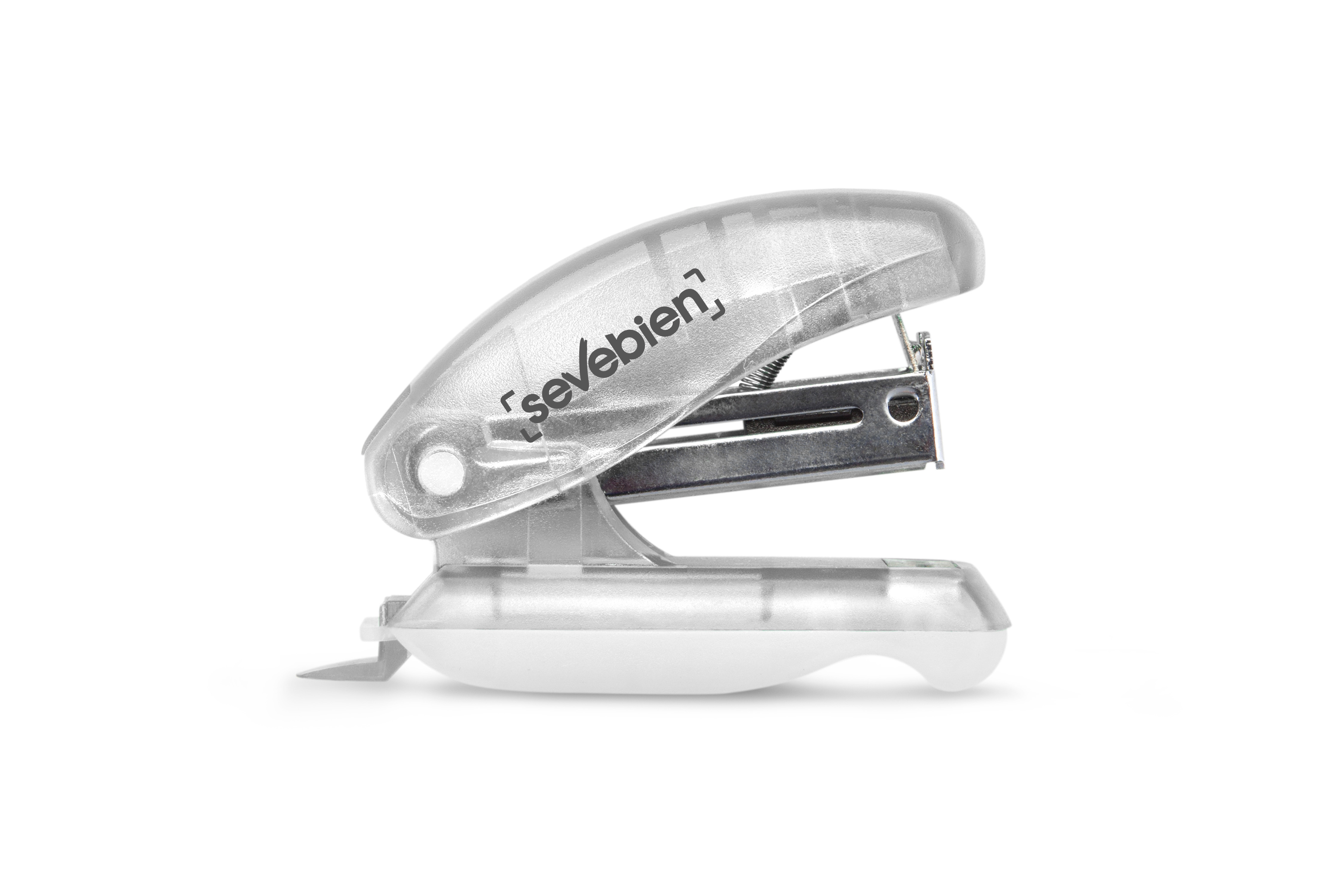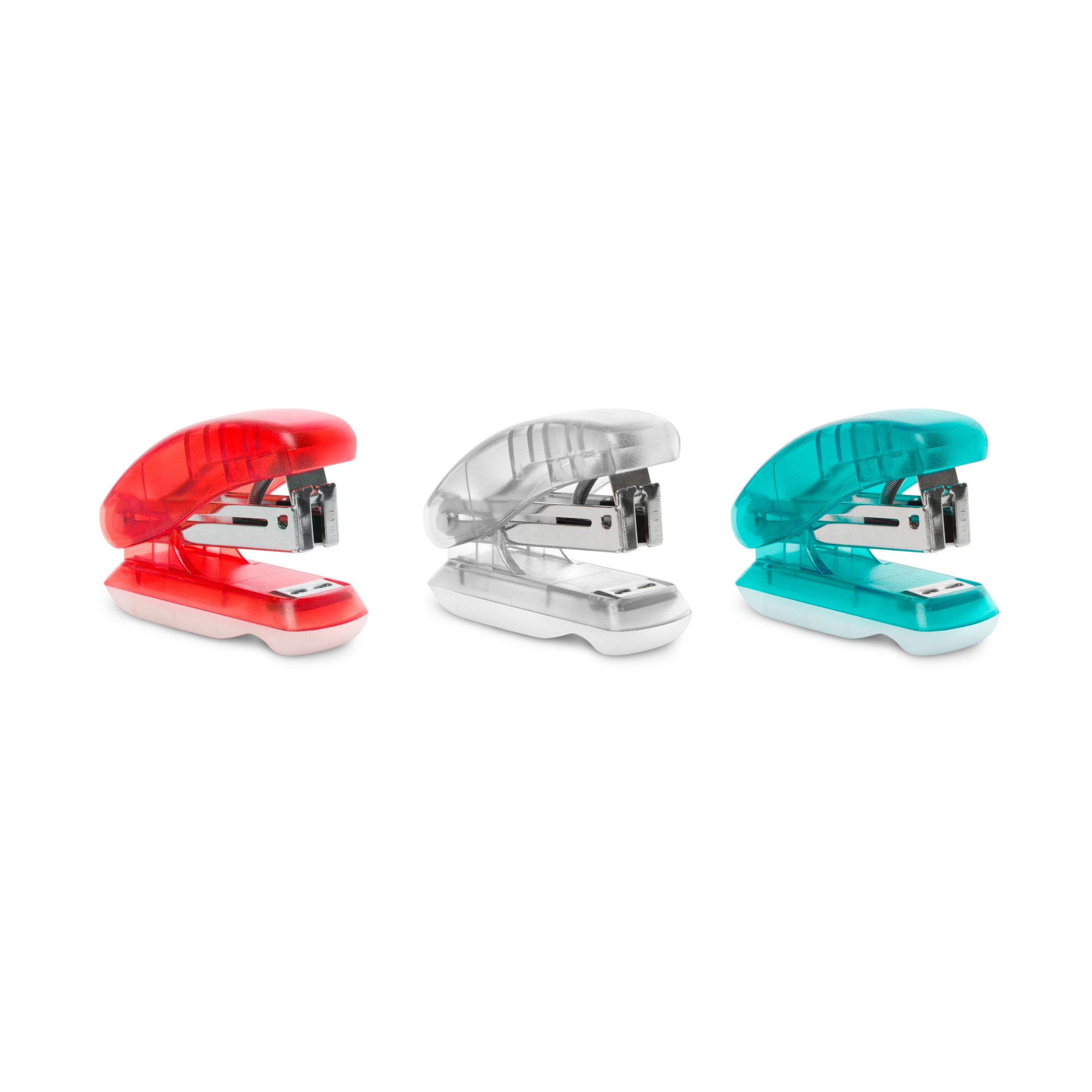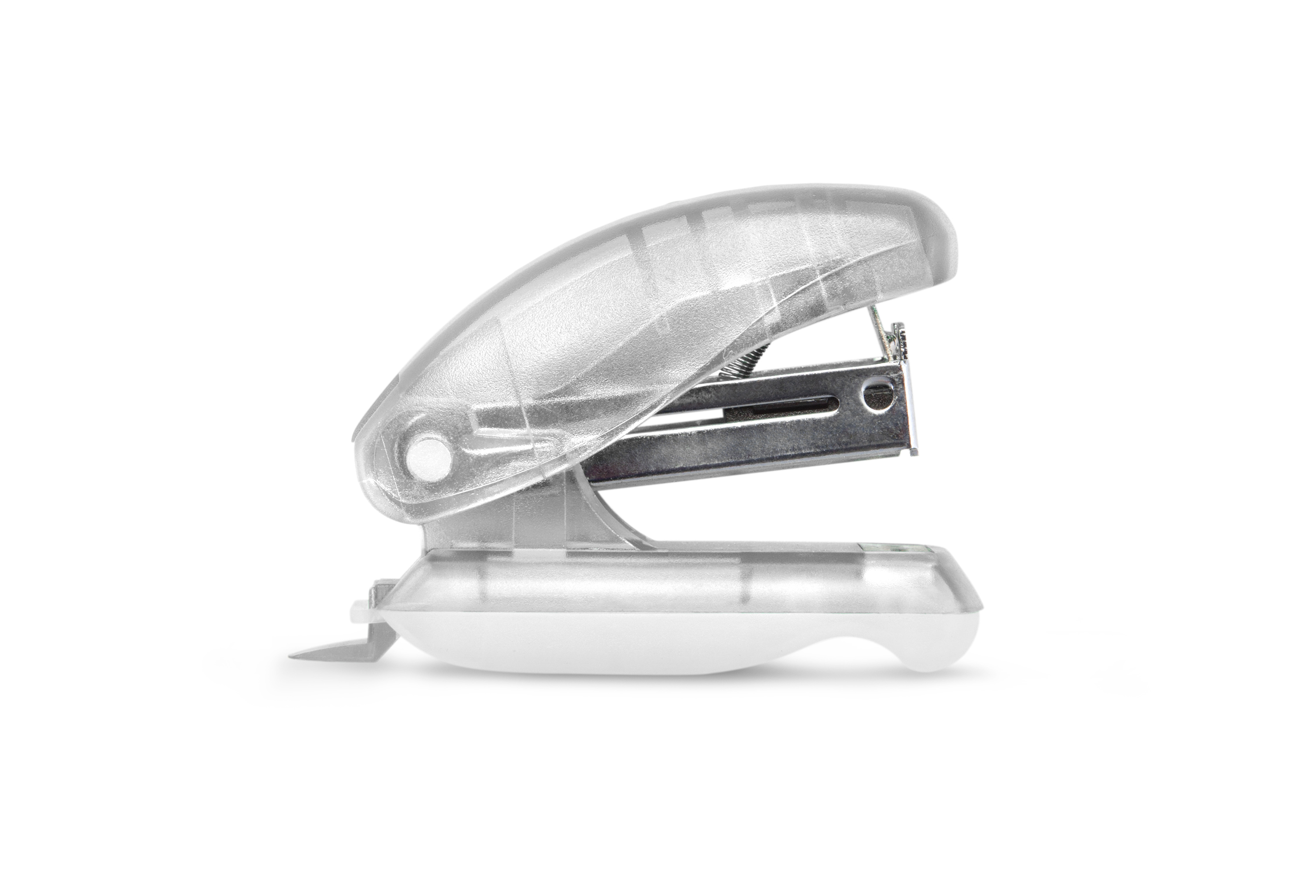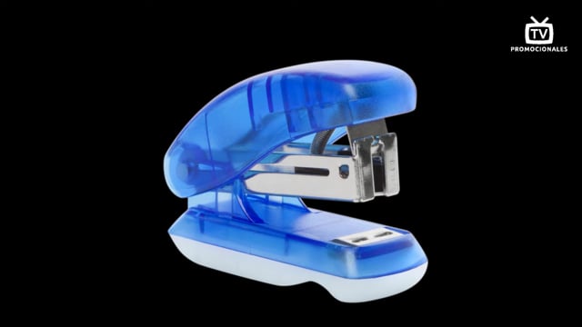 5,5 x 5 cm. Plástico transparente. Engrapadora de escritorio con saca engrapadora en la parte trasera.