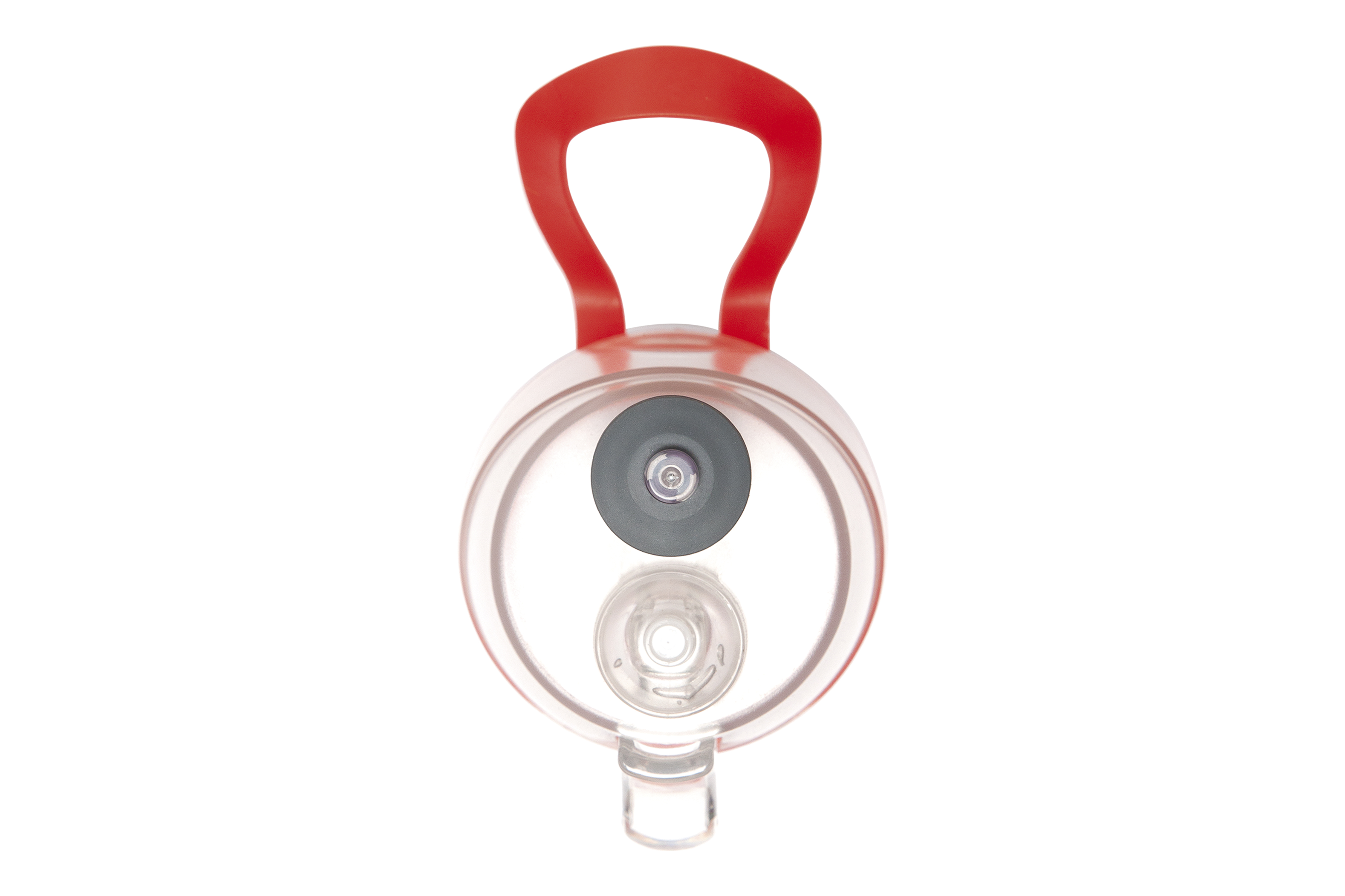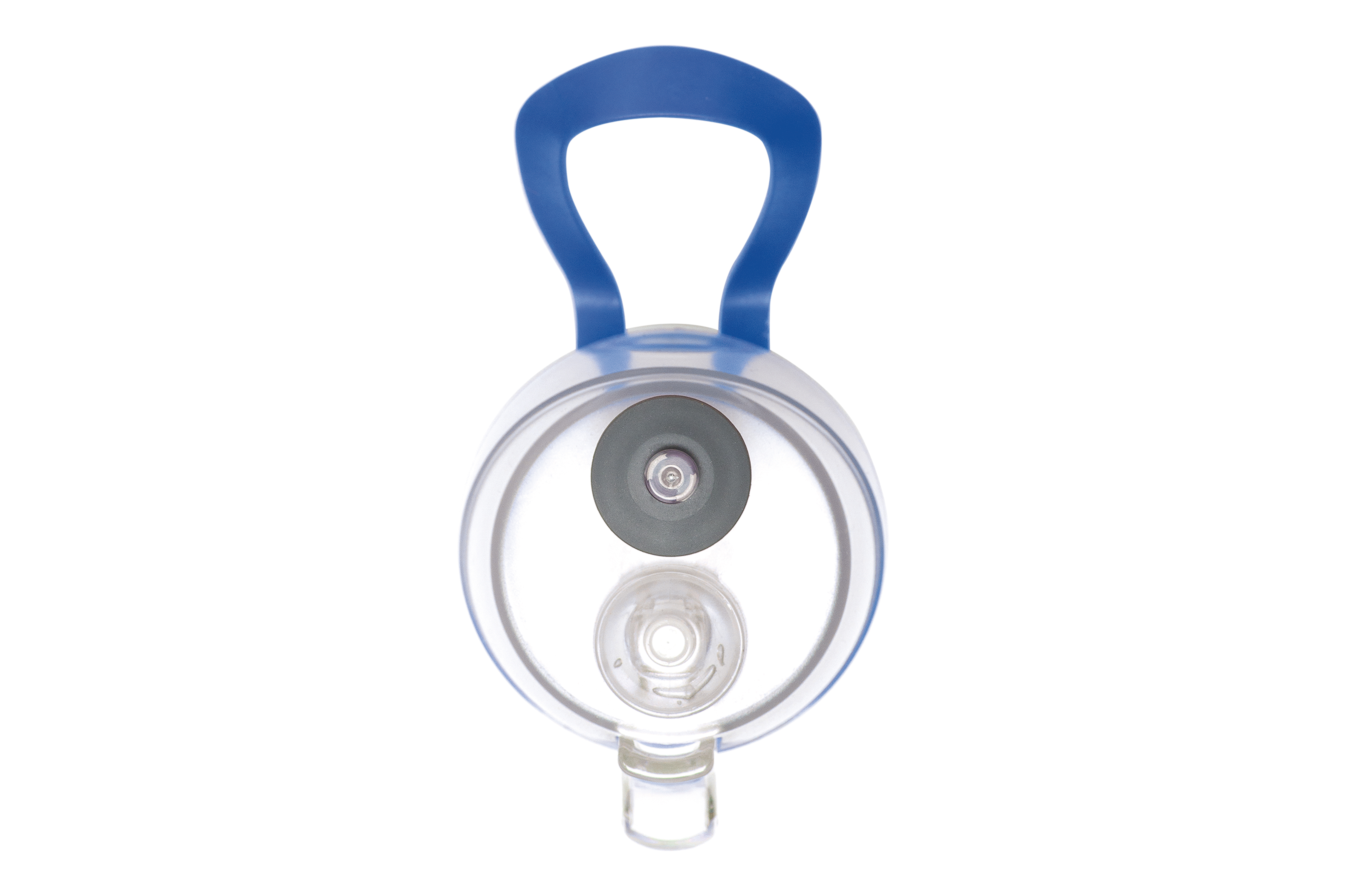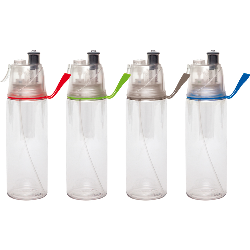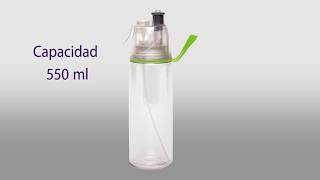 Ø 6,5 x 18 cm. Capacidad 550 ml. Plástico. Tapa plástica a rosca, boquilla deportiva engomada y rociador con botón que emite una suave brisa. Incluye una correa de color que facilita el agarre.