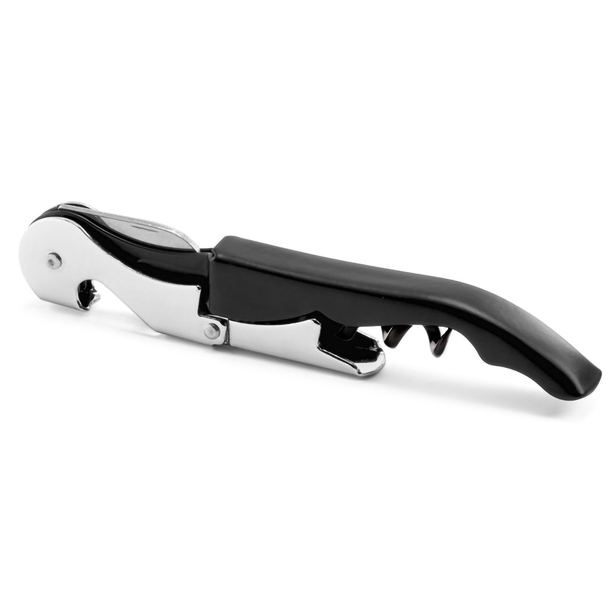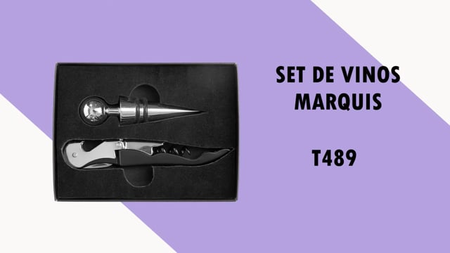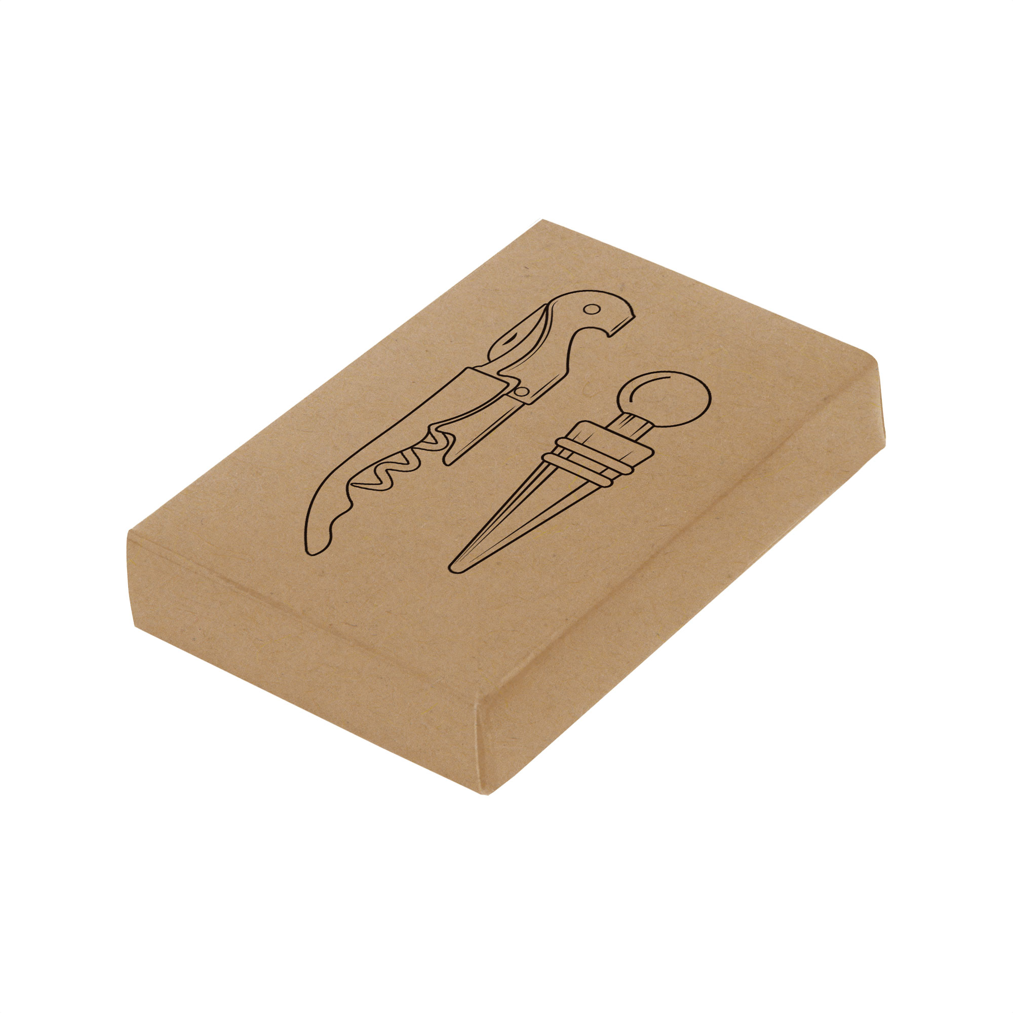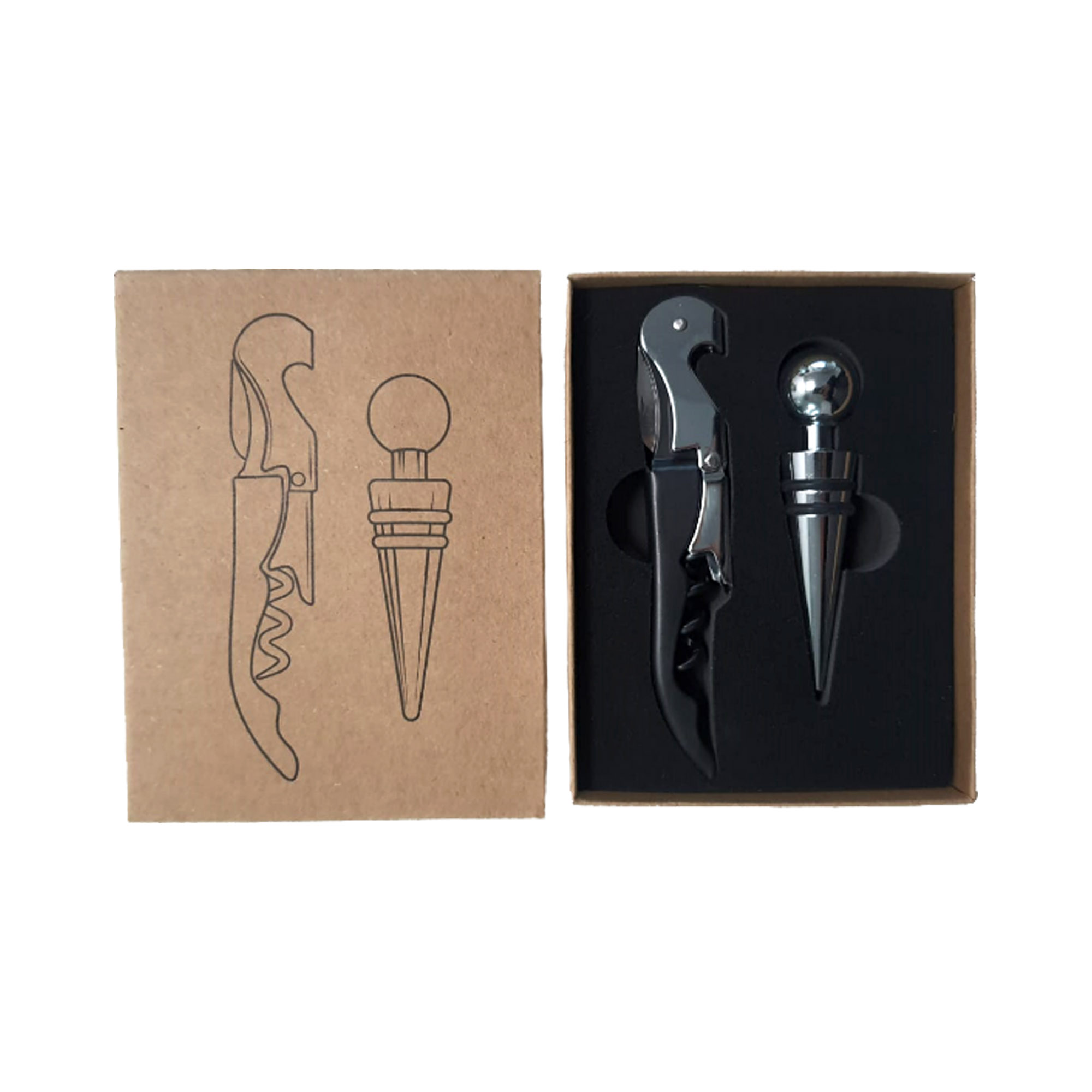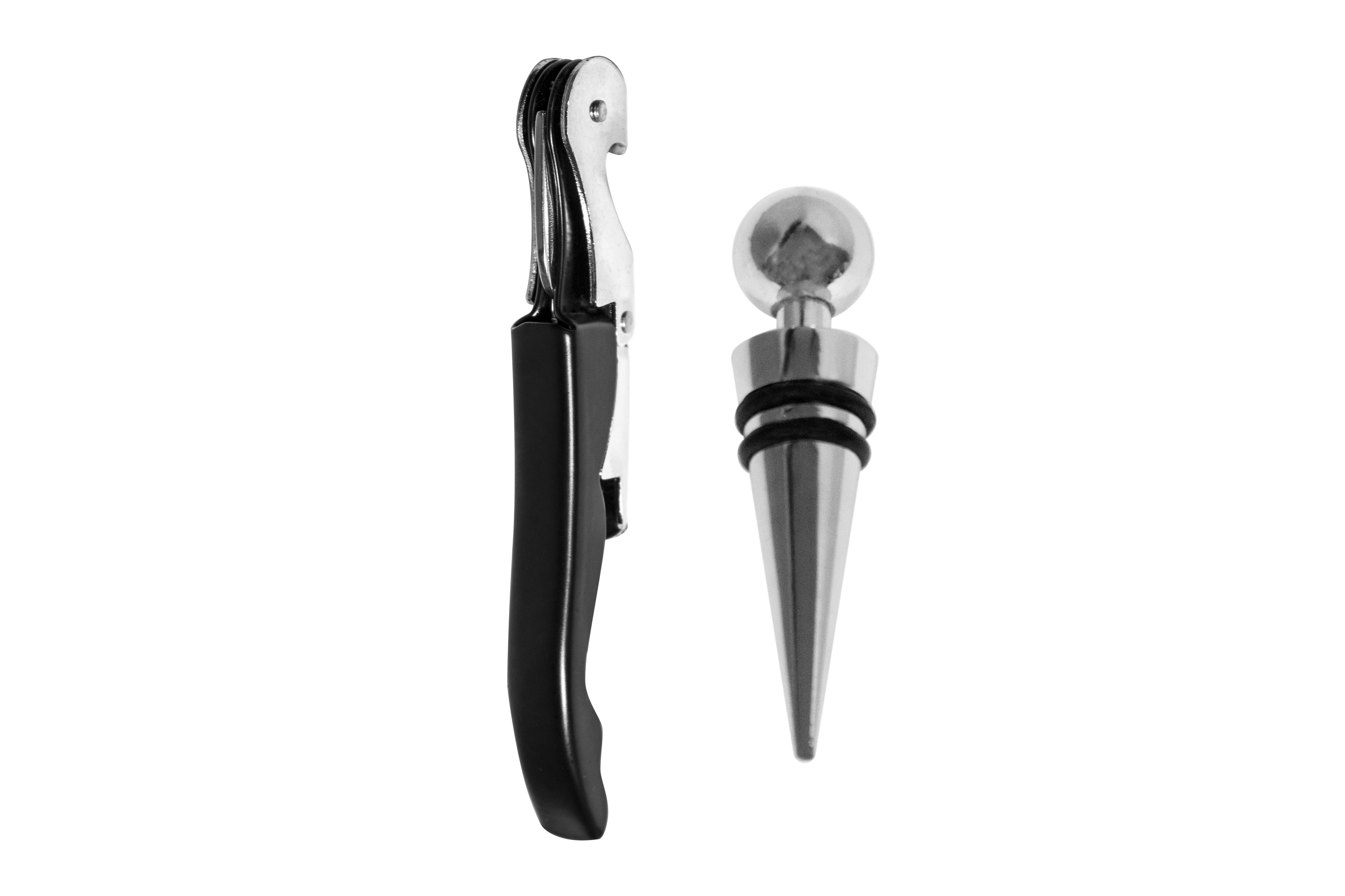 13 x 10 x 2,5 cm. Metal. Accesorios para vinos. Sacacorcho y tapón en metal. Estuche de cartón. Presentación en caja de regalo.