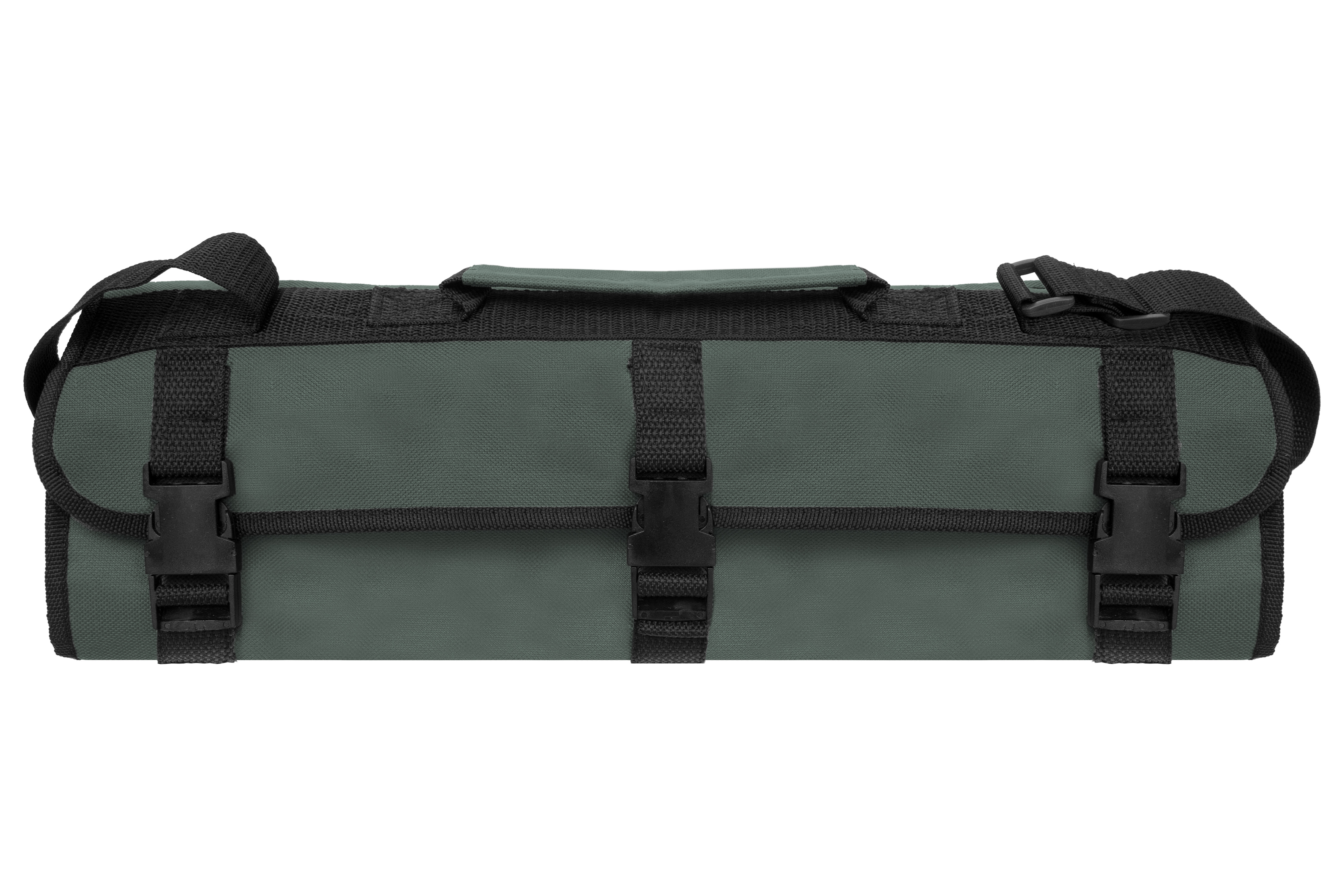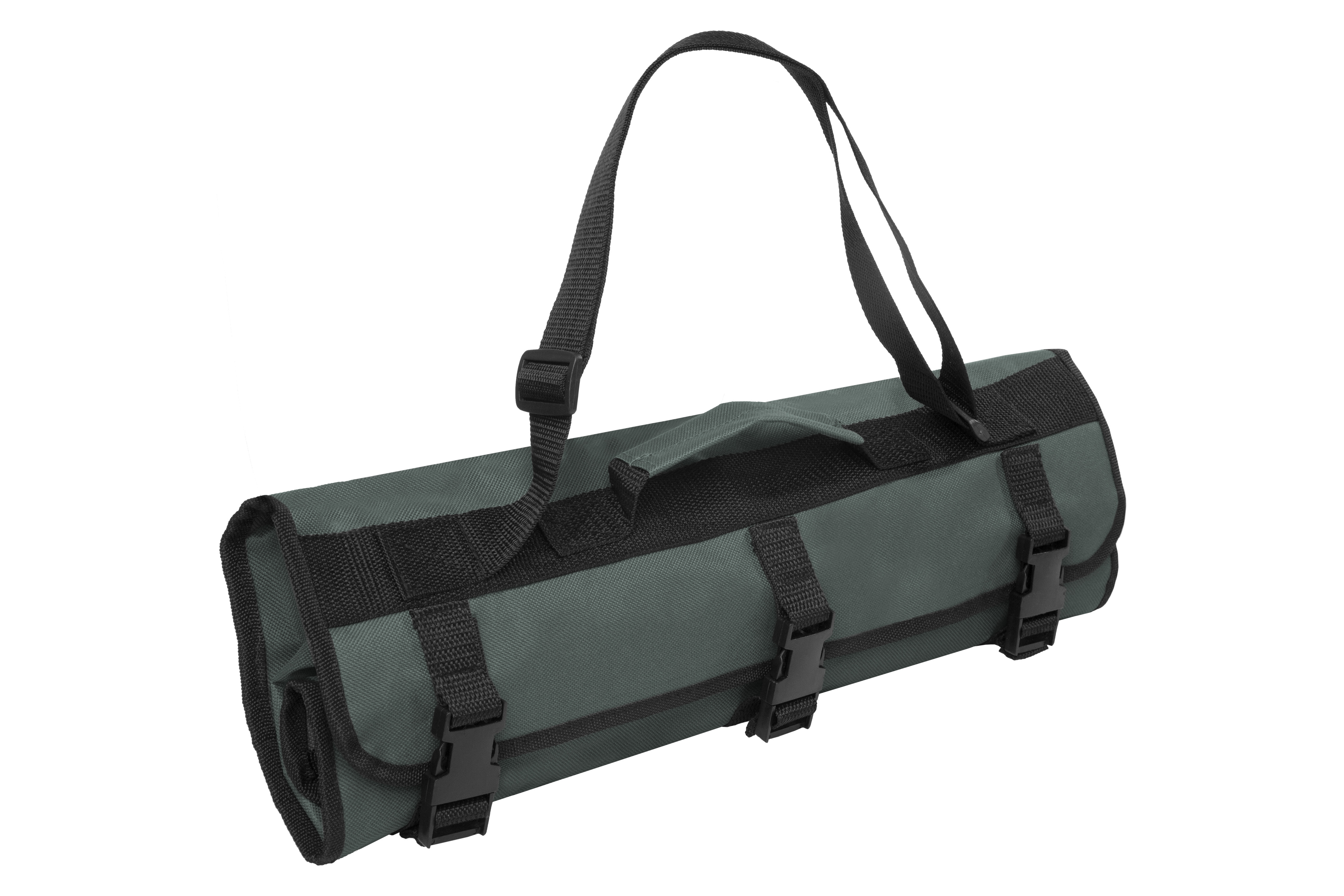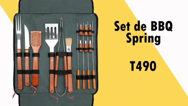 Ø 9 x 46 cm. (cerrado) 60 x 46 cm. (abierto). Poliester y acero inoxidable. Set de accesorios para asador. Incluye: tenedor asador, cuchillo, espatula, pinza, brocha, 4 brochetas largas y 6 brochetas pequeñas. Estuche de polyester con manija y tres hebillas plásticas para cerrar.