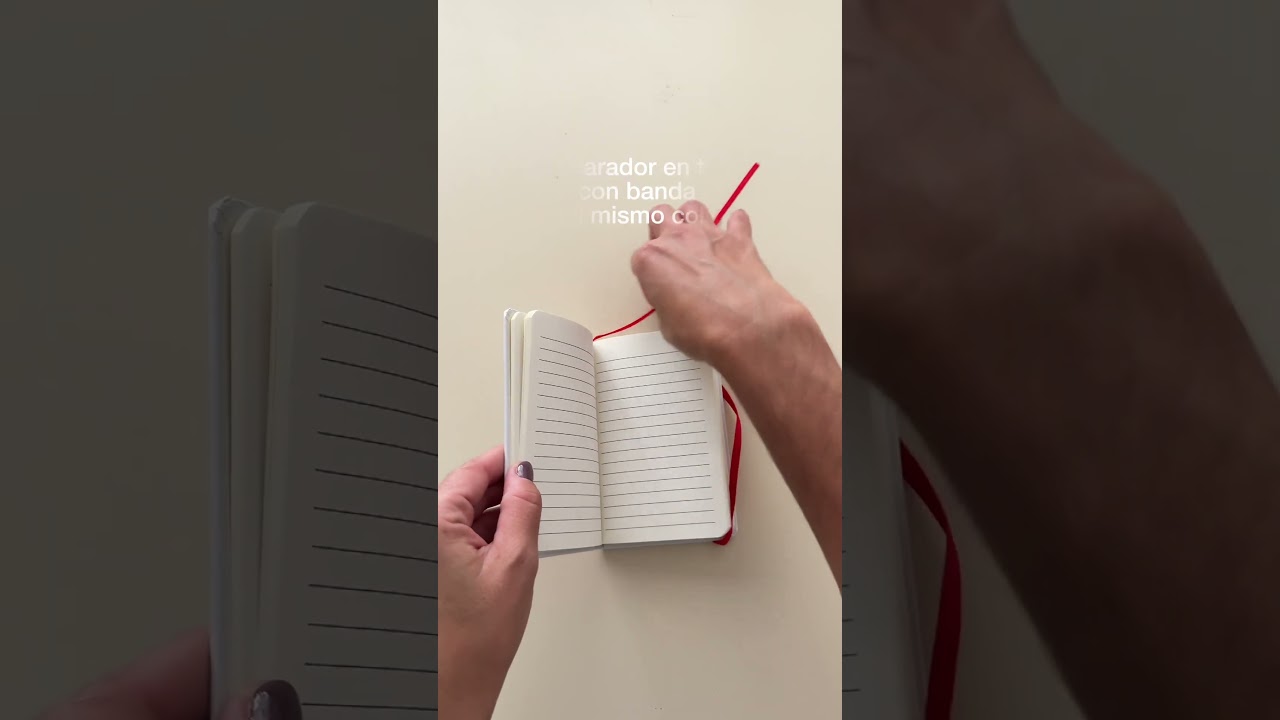 14,3 x 9,2 x 1,1 cm. Cartón. Libreta de pasta dura color blanco. Contiene 80 hojas rayadas, separador de tela. Cierra con banda elástica de color.