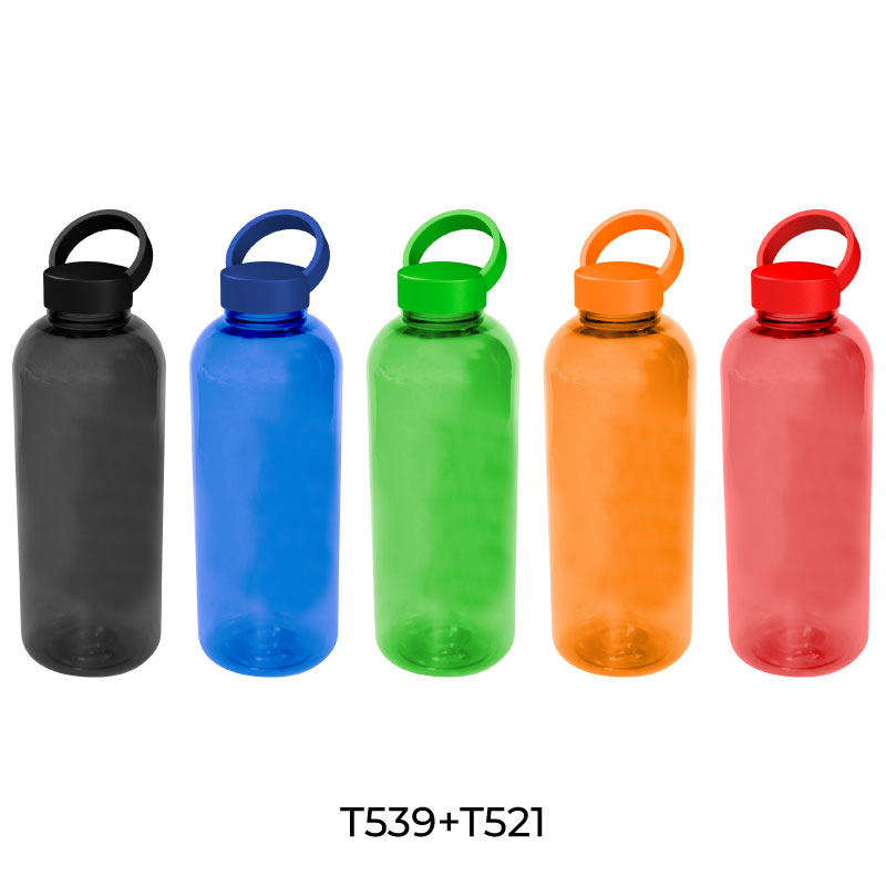 Ø 8 x 20,5 cm. Plástico PET. Capacidad 810 ml. Peso del botella: 63 gramos - Peso de la tapa: 12 gramos. Plástico. Cuerpo de color traslucido. No apto para bebidas calientes. Libre de BPA.