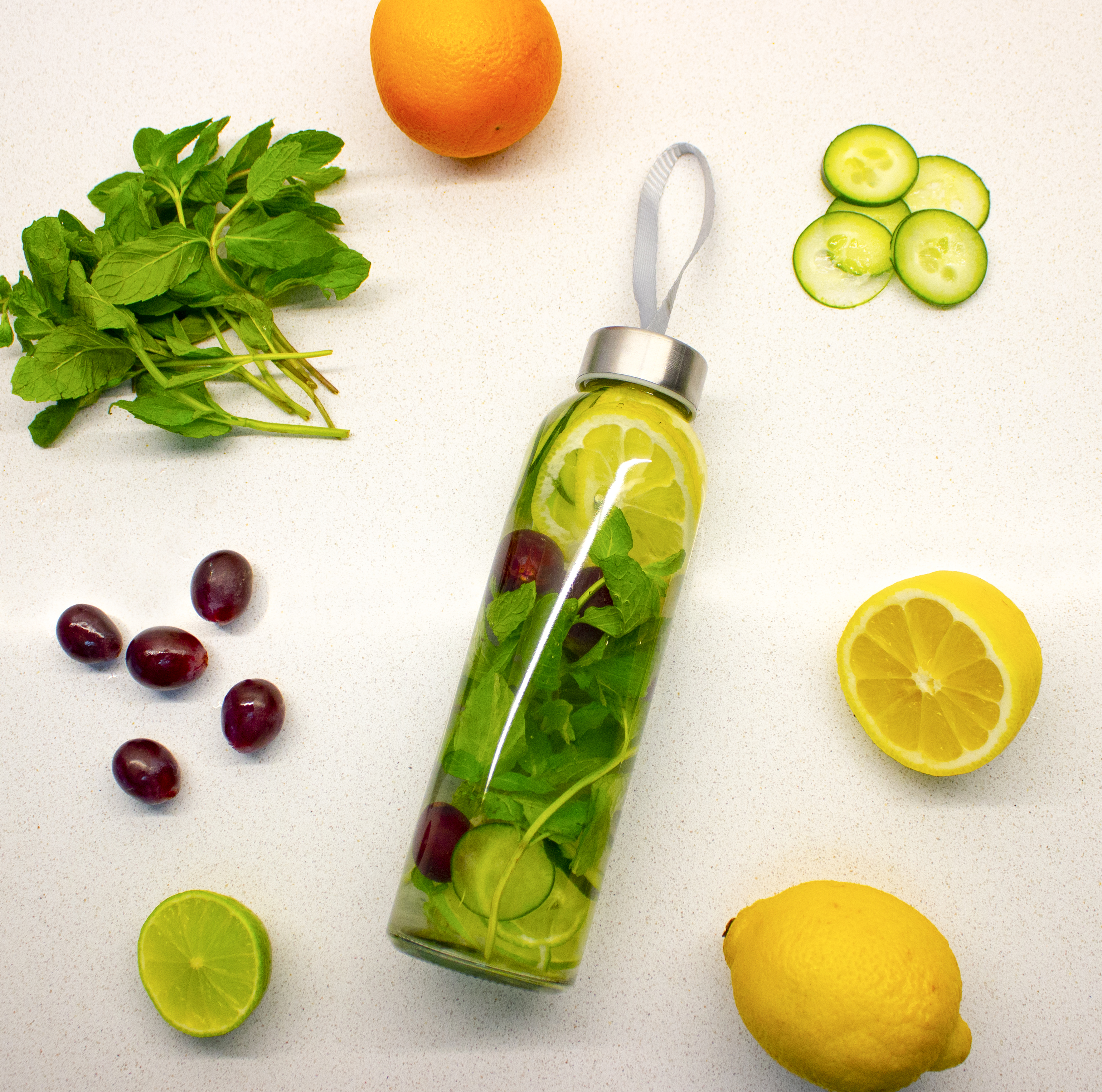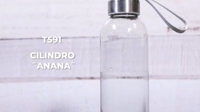 Ø 6,2 x 23 cm. Capacidad 500 ml. Vidrio resistente. Cuerpo traslúcido con tapa de acero inoxidable y tira color gris que permite transportarla. Presentación en caja de regalo.