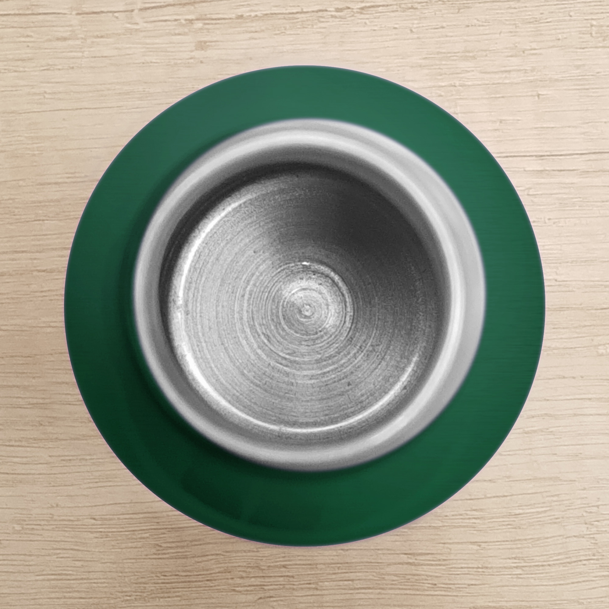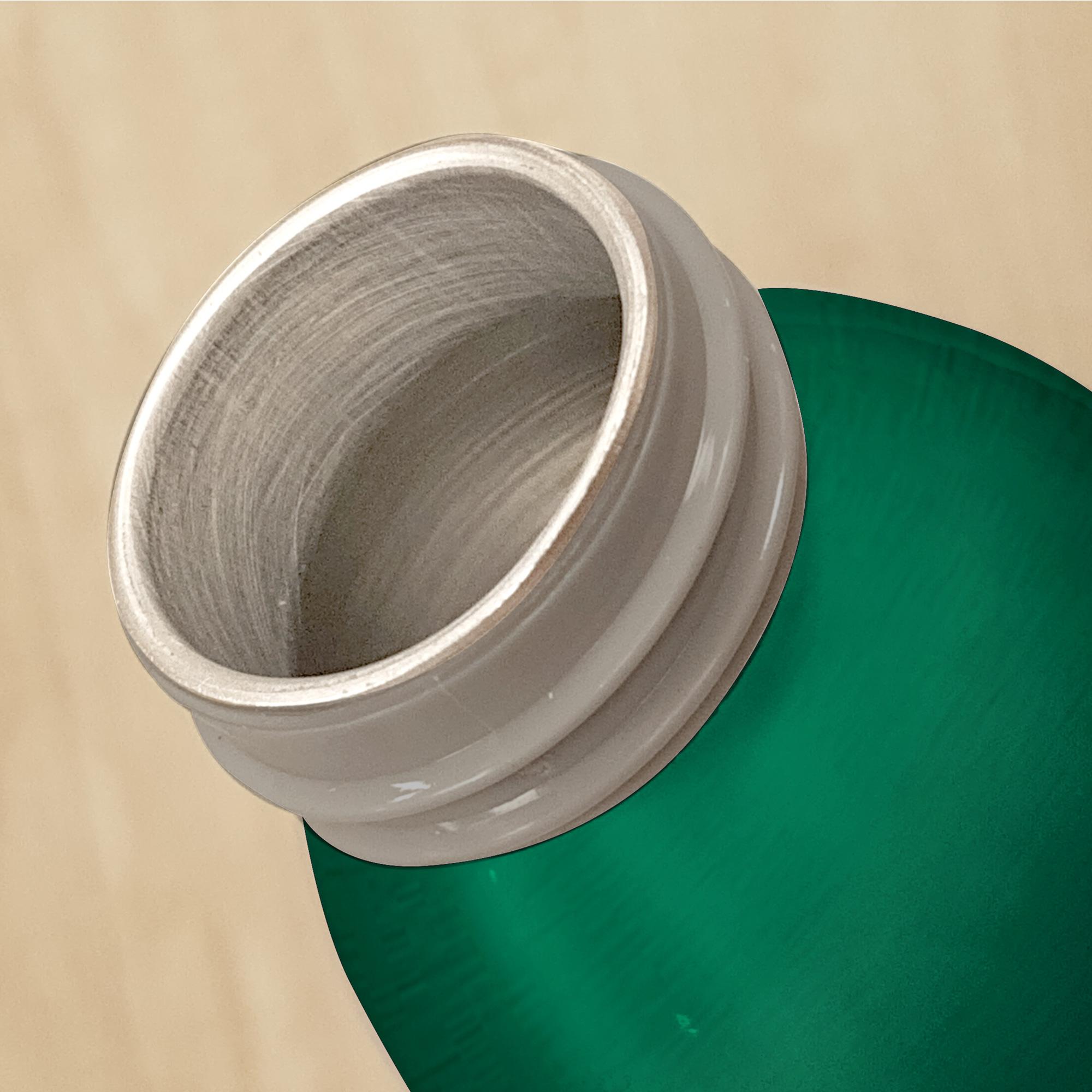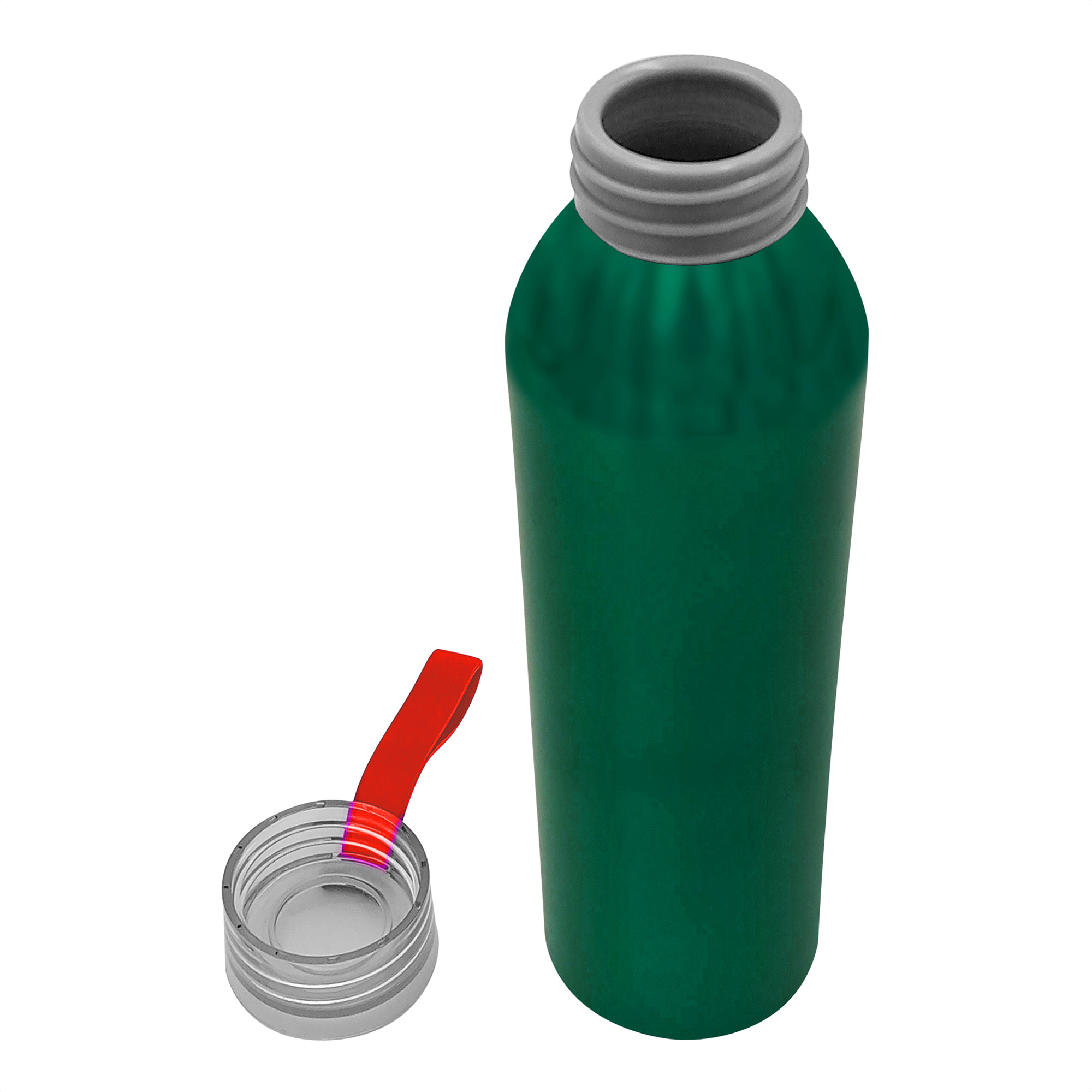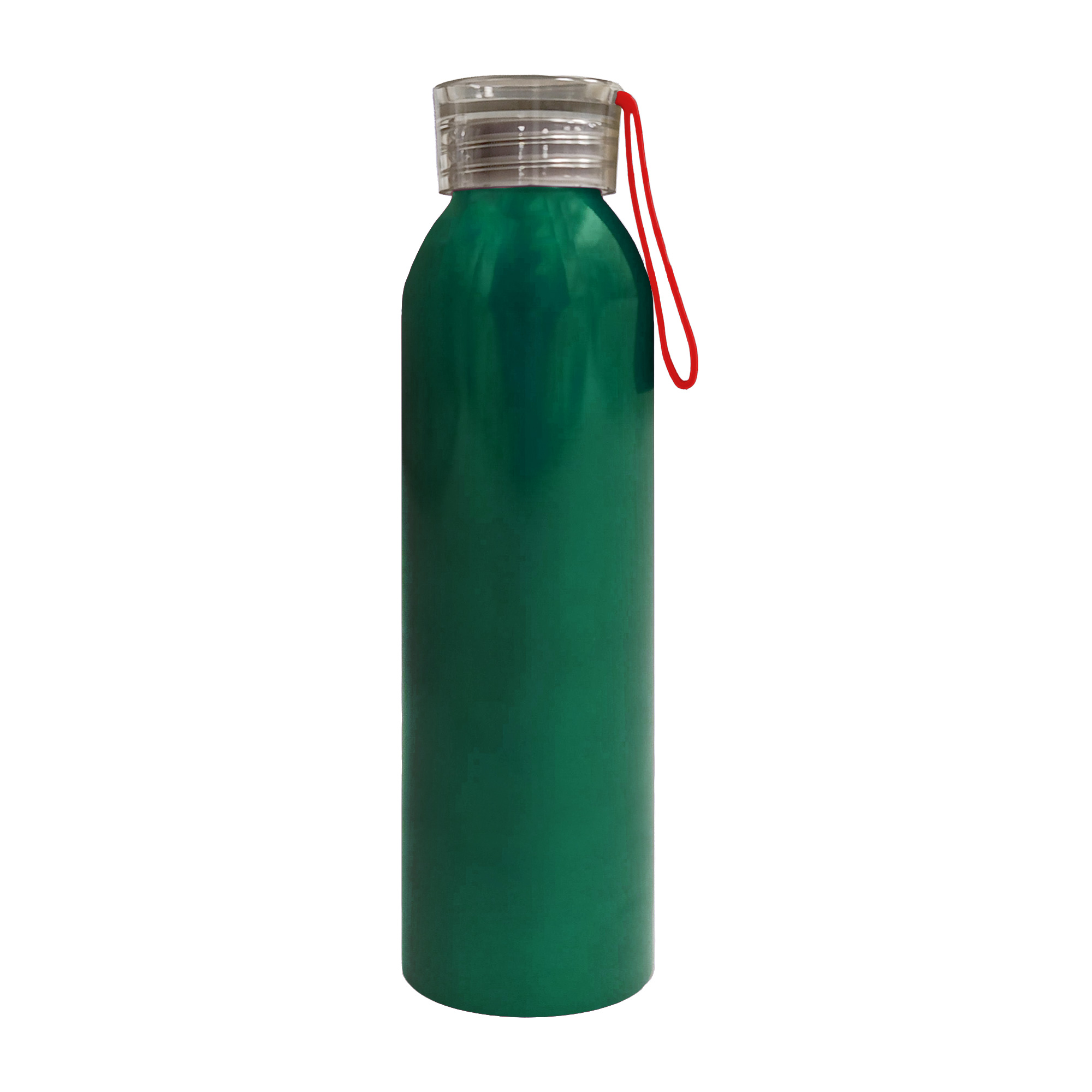 Ø 6,6 x 23,2 cm. Capacidad 600 ml. Aluminio. Botella de aluminio con cuerpo color. Tapa transparente con tira de silicona (de 8 cm) del mismo color que el cuerpo de la botella (blanco, negro, rojo y azul). Cuerpo de botella recubierto con pintura especial para facilitar la impresión del producto. Presentación en caja de regalo.
