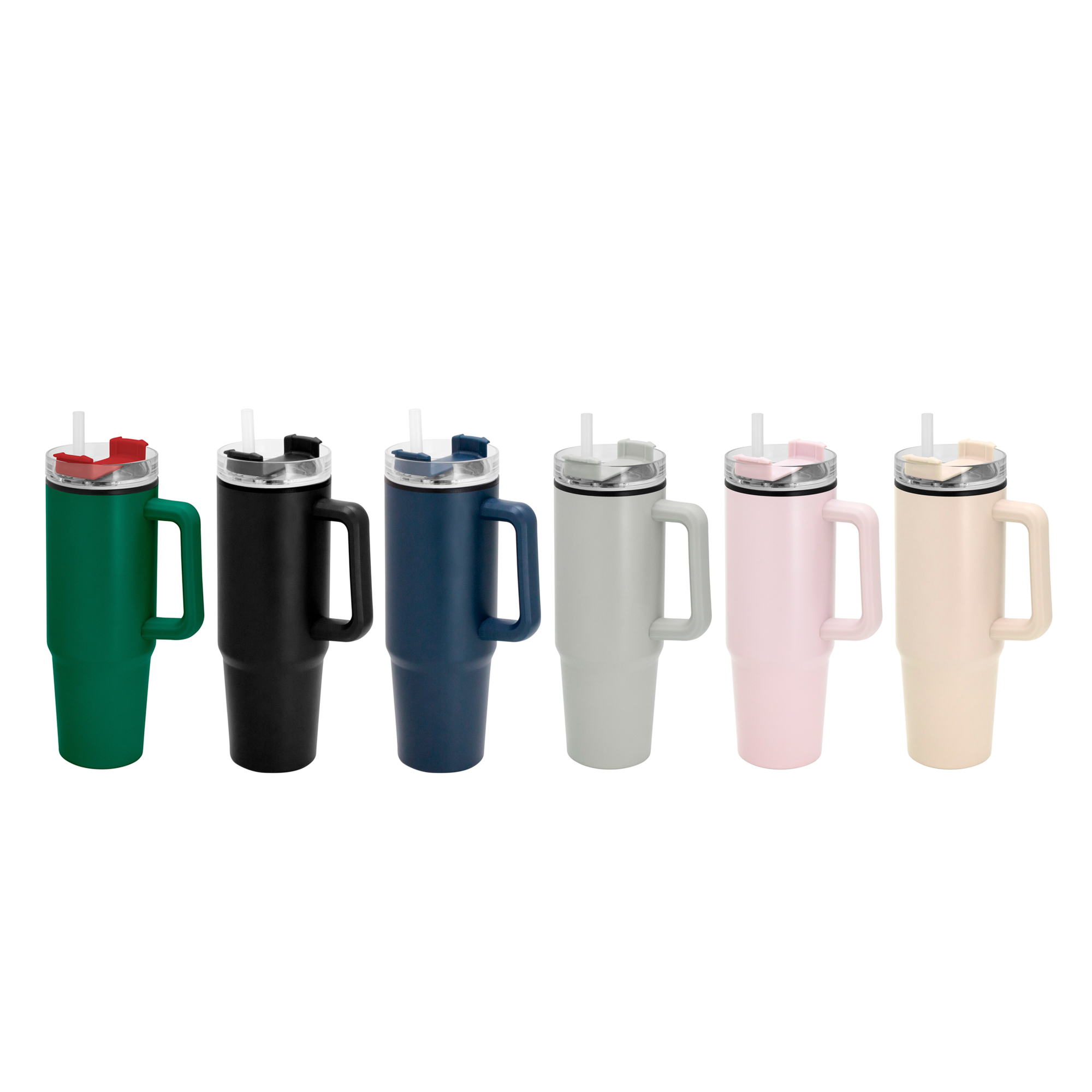 Mug doble pared con popote. Interior de plástico Polipropileno y exterior de acero 201. Tapa plástica transparente a rosca con anillo de silicona. Cierre giratorio porta sorbete. Popote plástico translucido. Pintura exterior con acabado mate. Mantiene las bebidas frías y calientes por más tiempo.