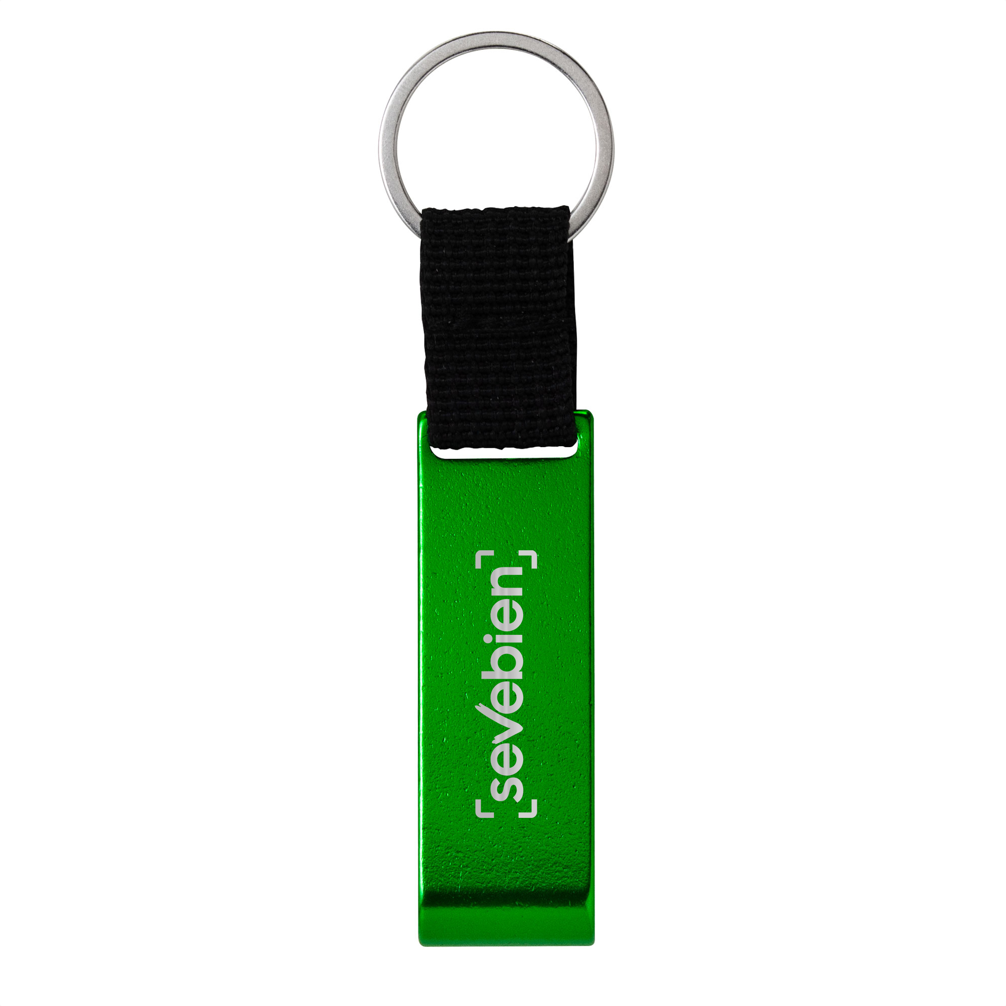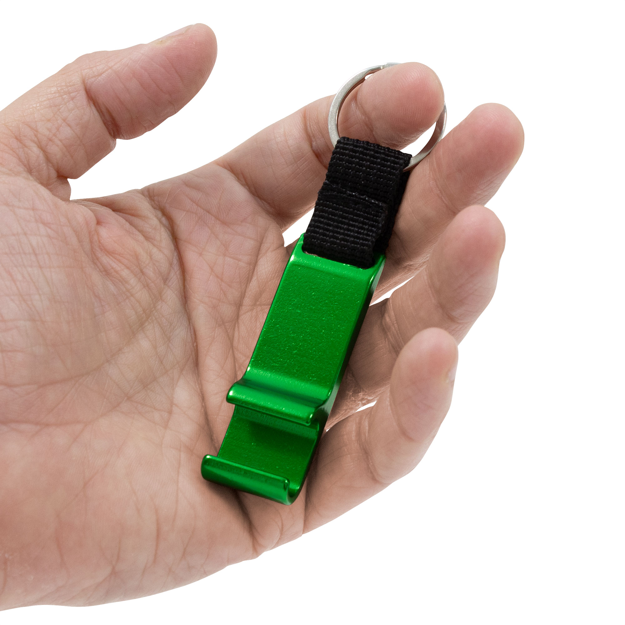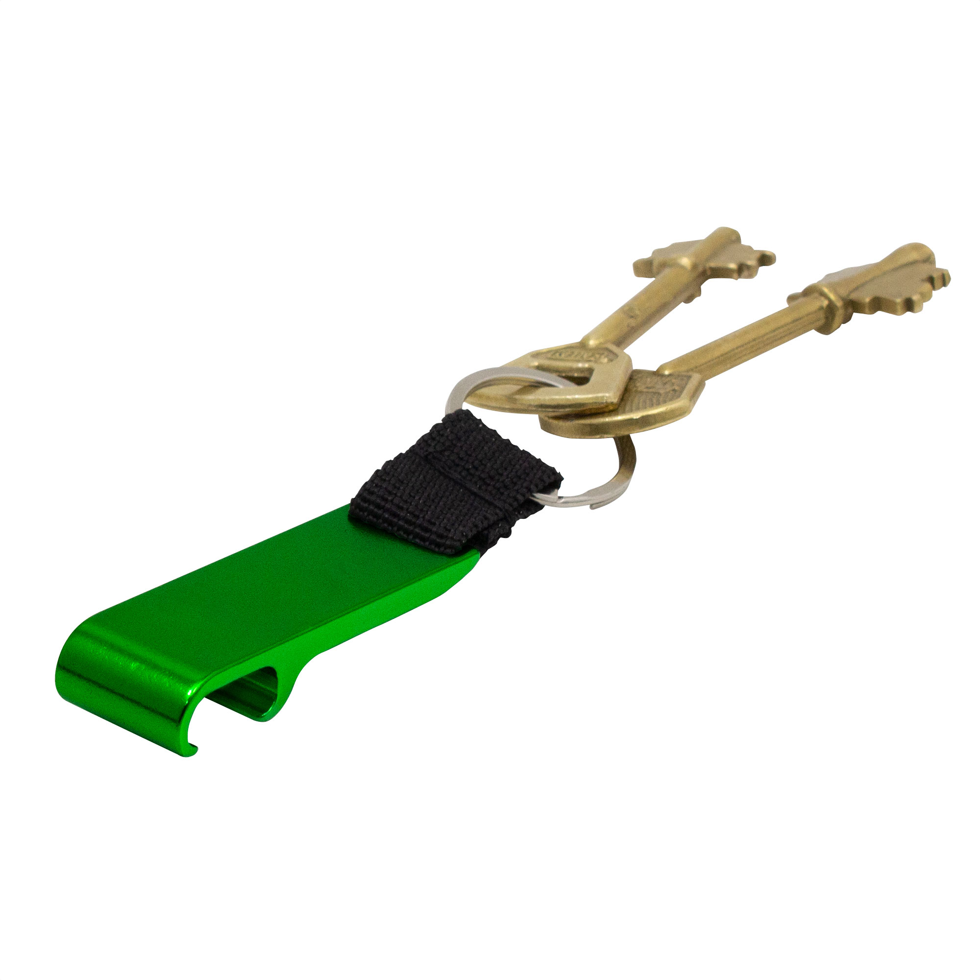Llavero destapador con correa de poliester color negro de 2.5 x 1.5cm. Pintura acabado brillante.