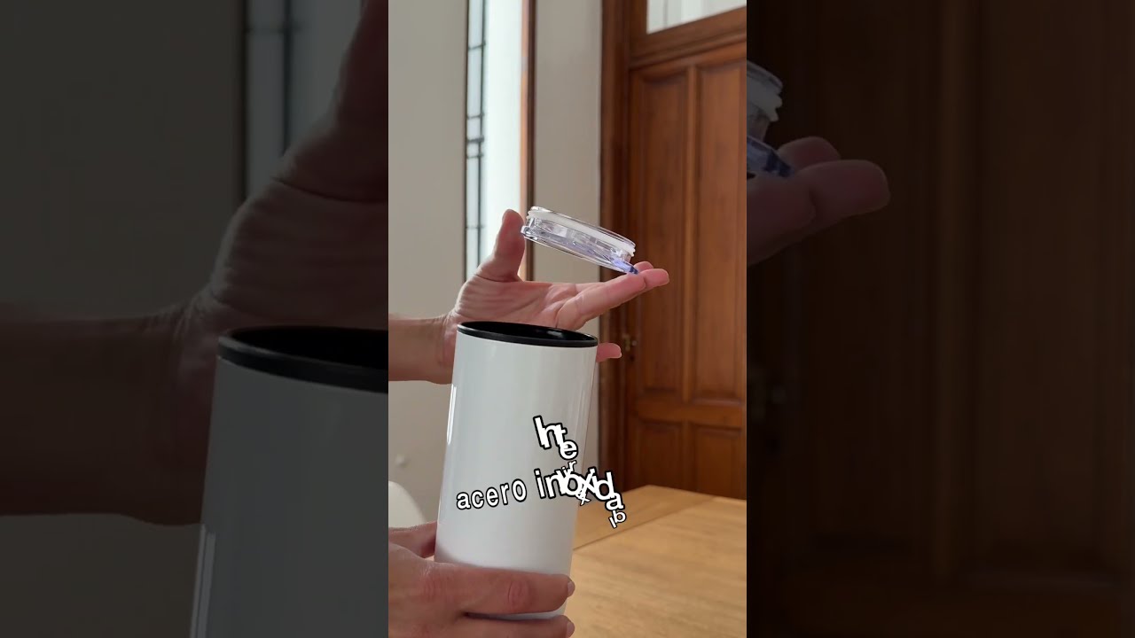 Mug doble pared. Interior en plástico y exterior de acero inoxidable 201. Tapa plástica transparente a presión con anillo de silicona. Base antideslizante.