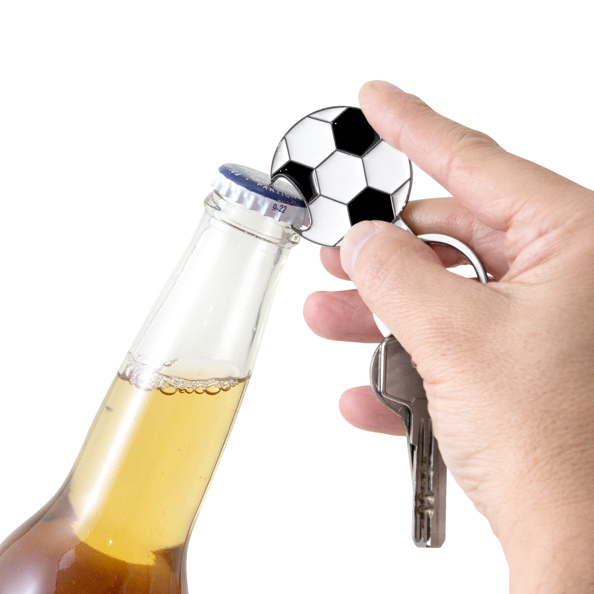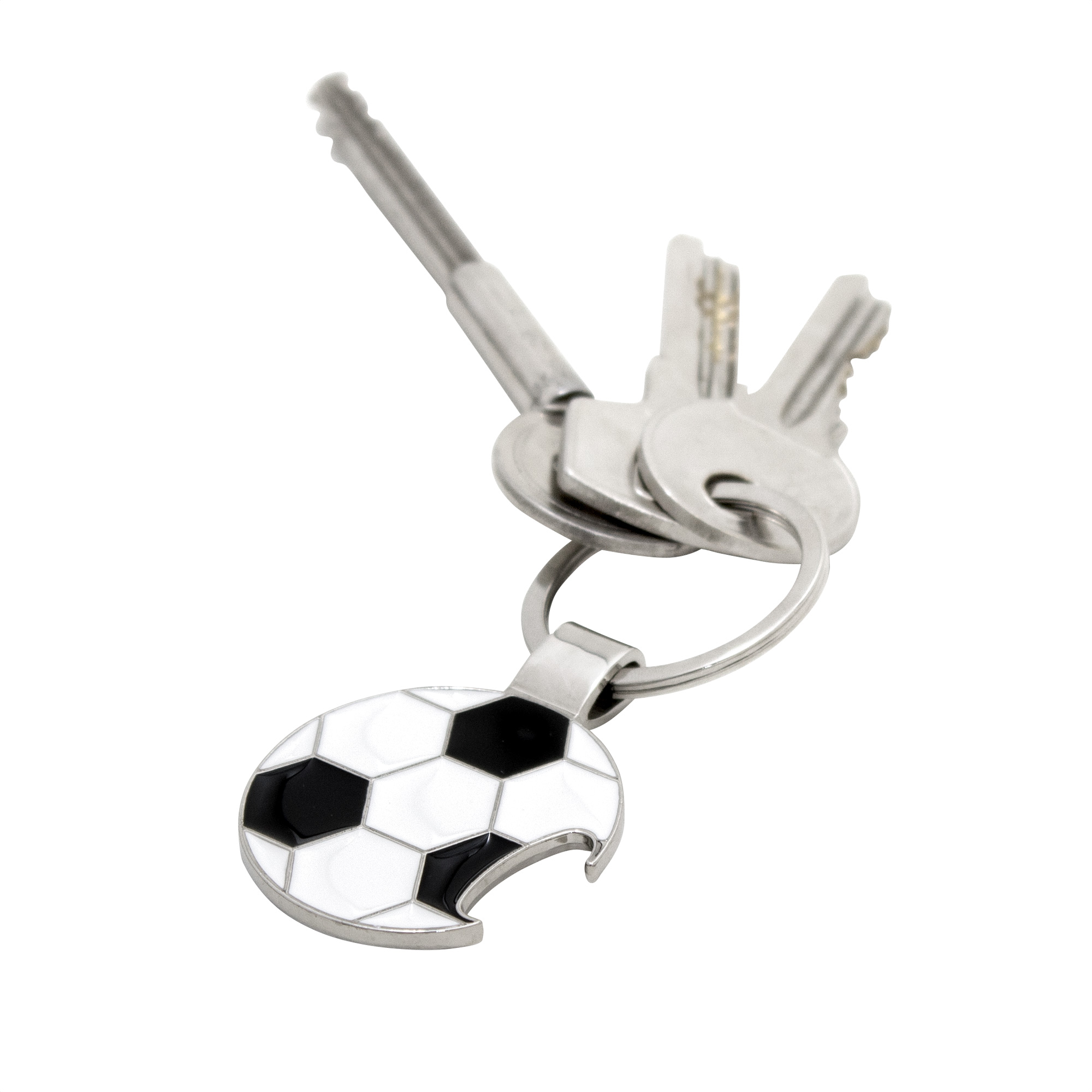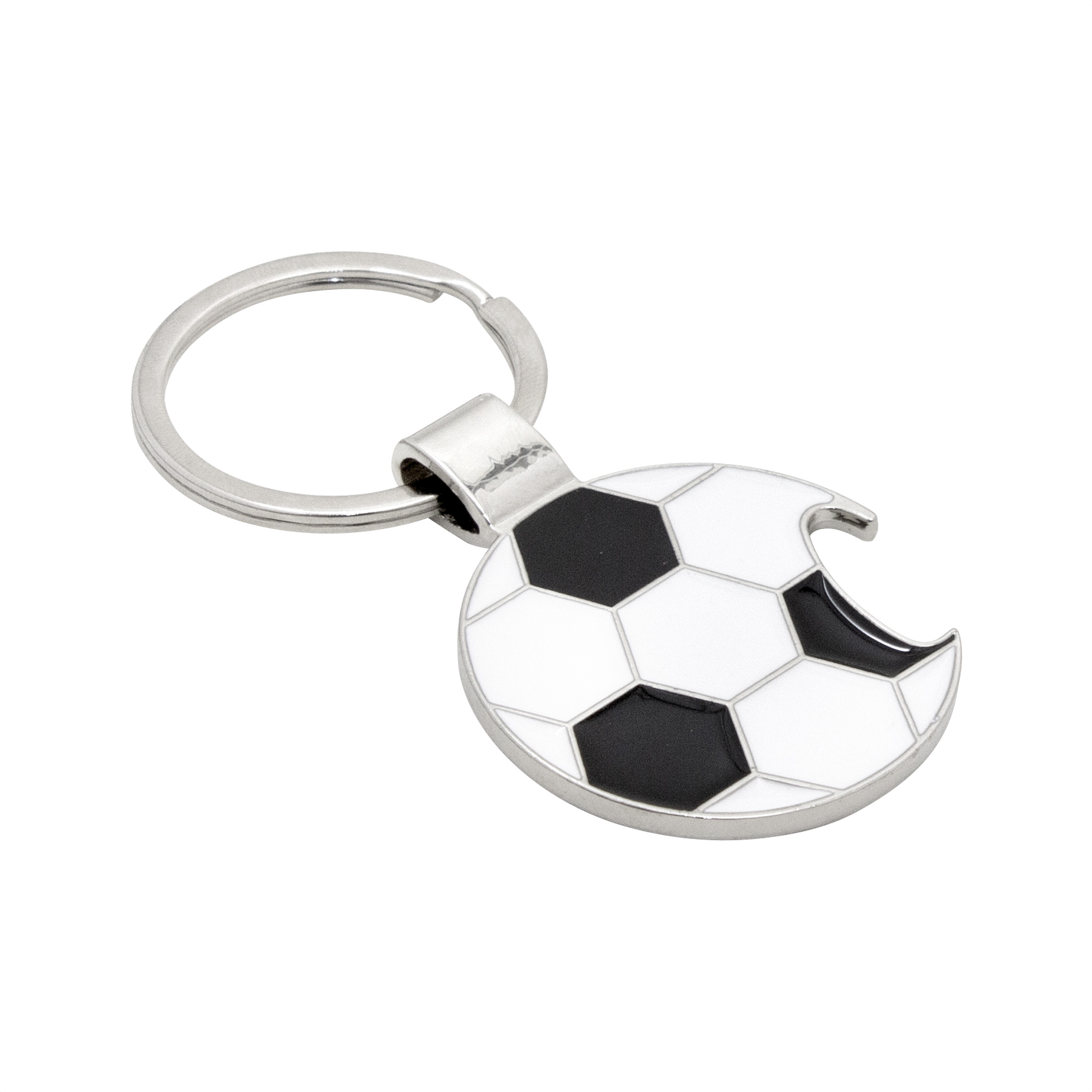 Llavero con destapador abre botellas. Estructura metálica con forma de pelota de fútbol pintada con esmalte brillante de colores negro y blanco.
