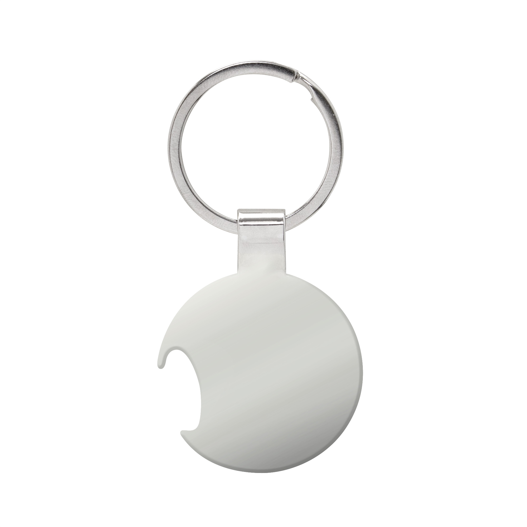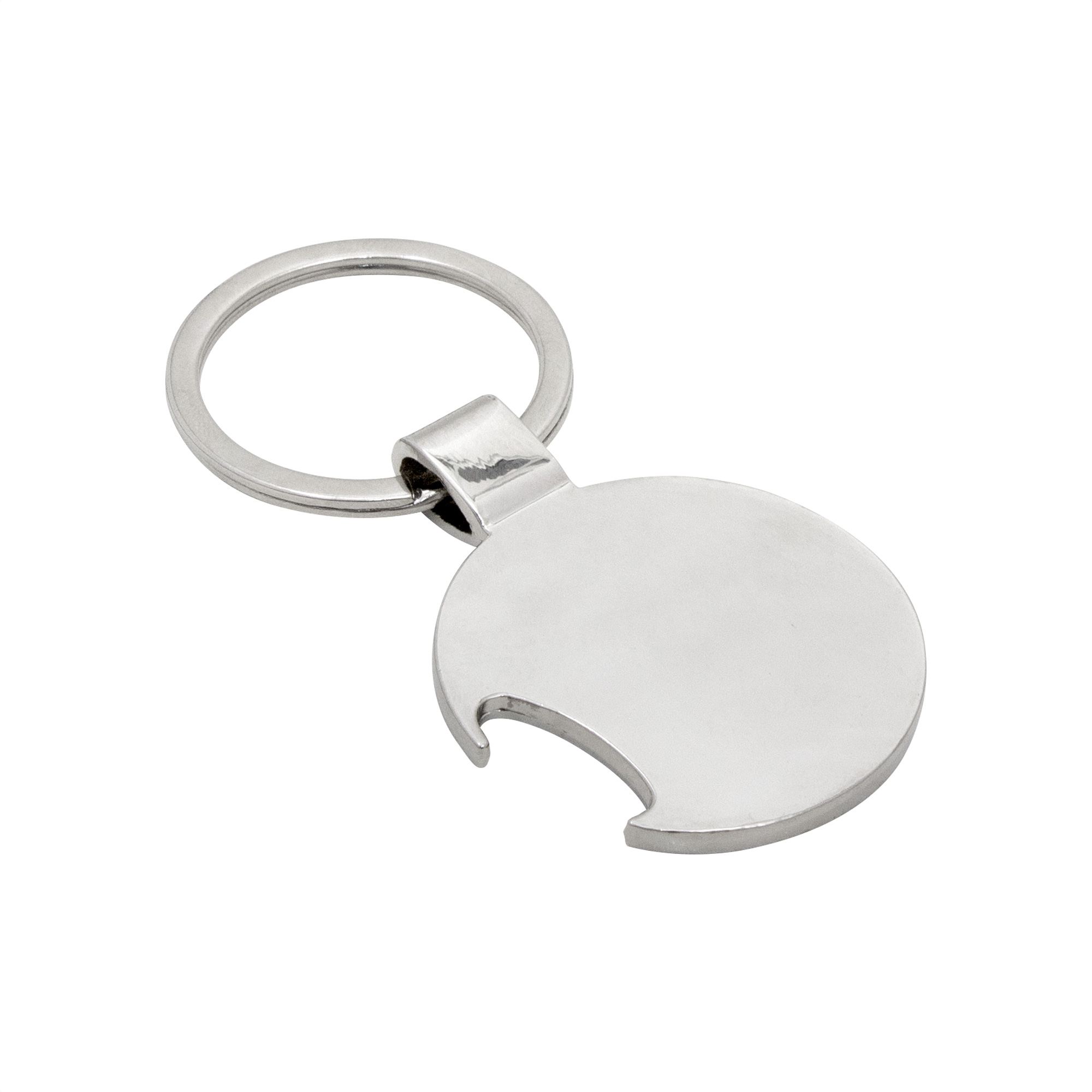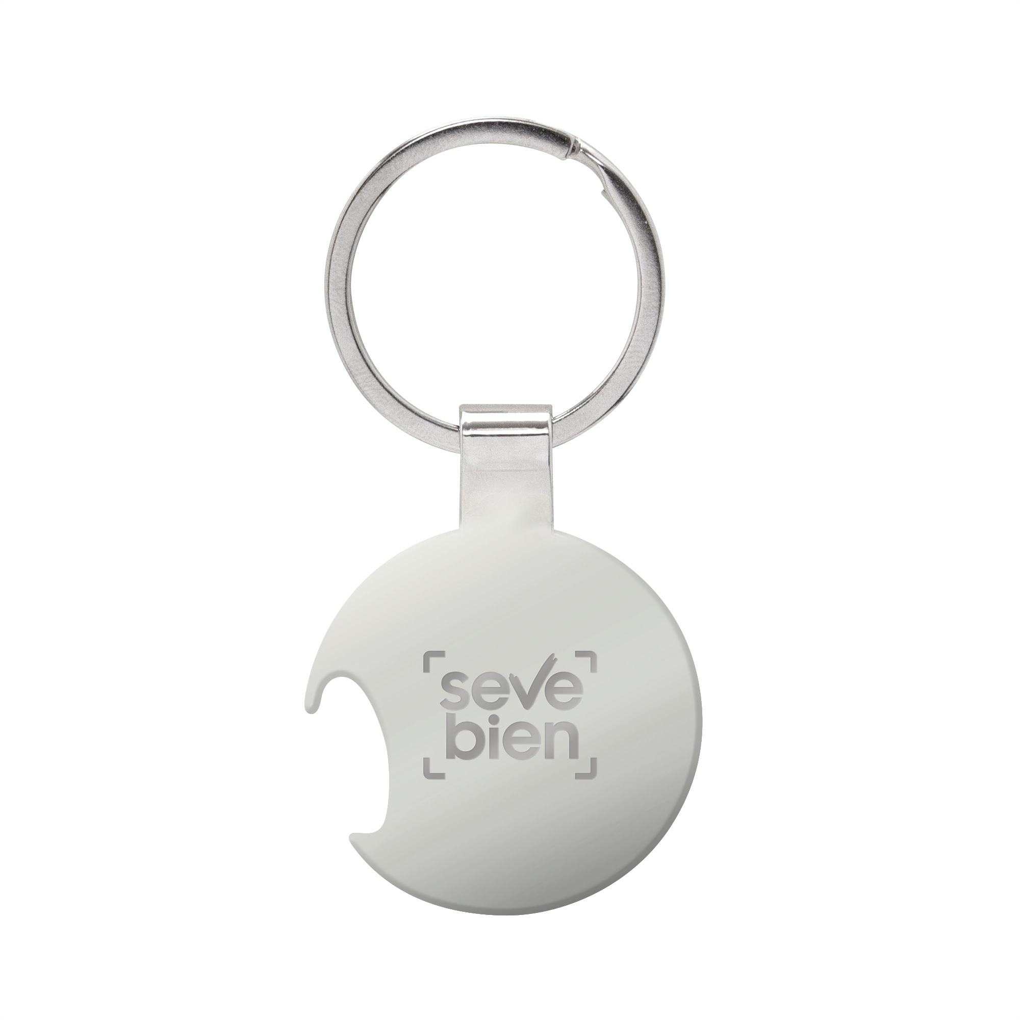 Llavero con destapador abre botellas. Estructura metálica con forma de pelota de fútbol pintada con esmalte brillante de colores negro y blanco.