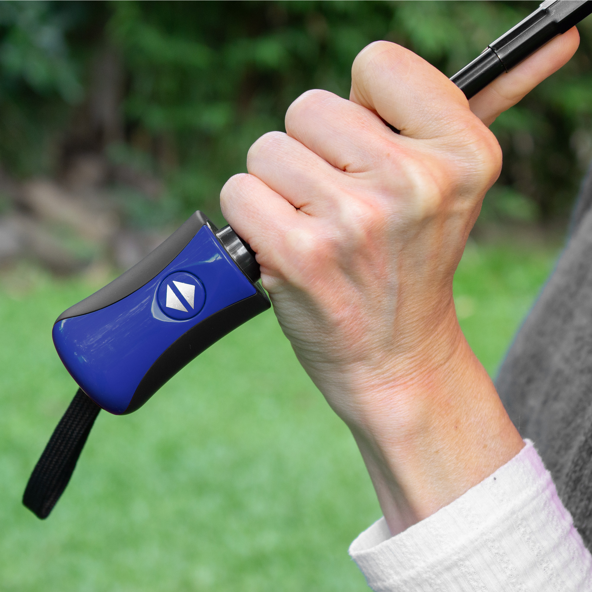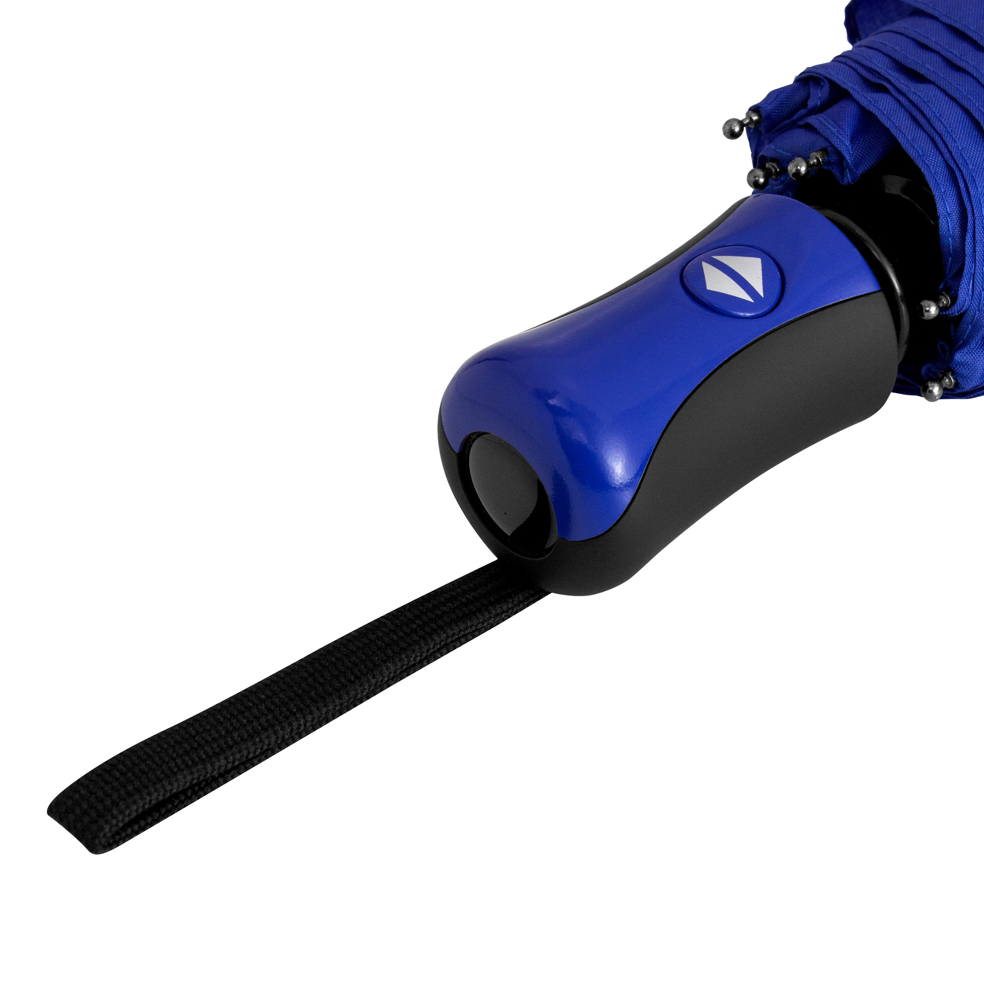 Paraguas APERTURA Y CIERRE AUTOMATICO. Eje metálico de color negro y varillas de fibra. Mango de plástico engomado con revestimiento de poliuretano color negro y detalles en color a tono con la tela, acabado brillante. Correa cordón color negro. Botón a presión. Tela con detalles en color negro. Cierre con correa de velcro.