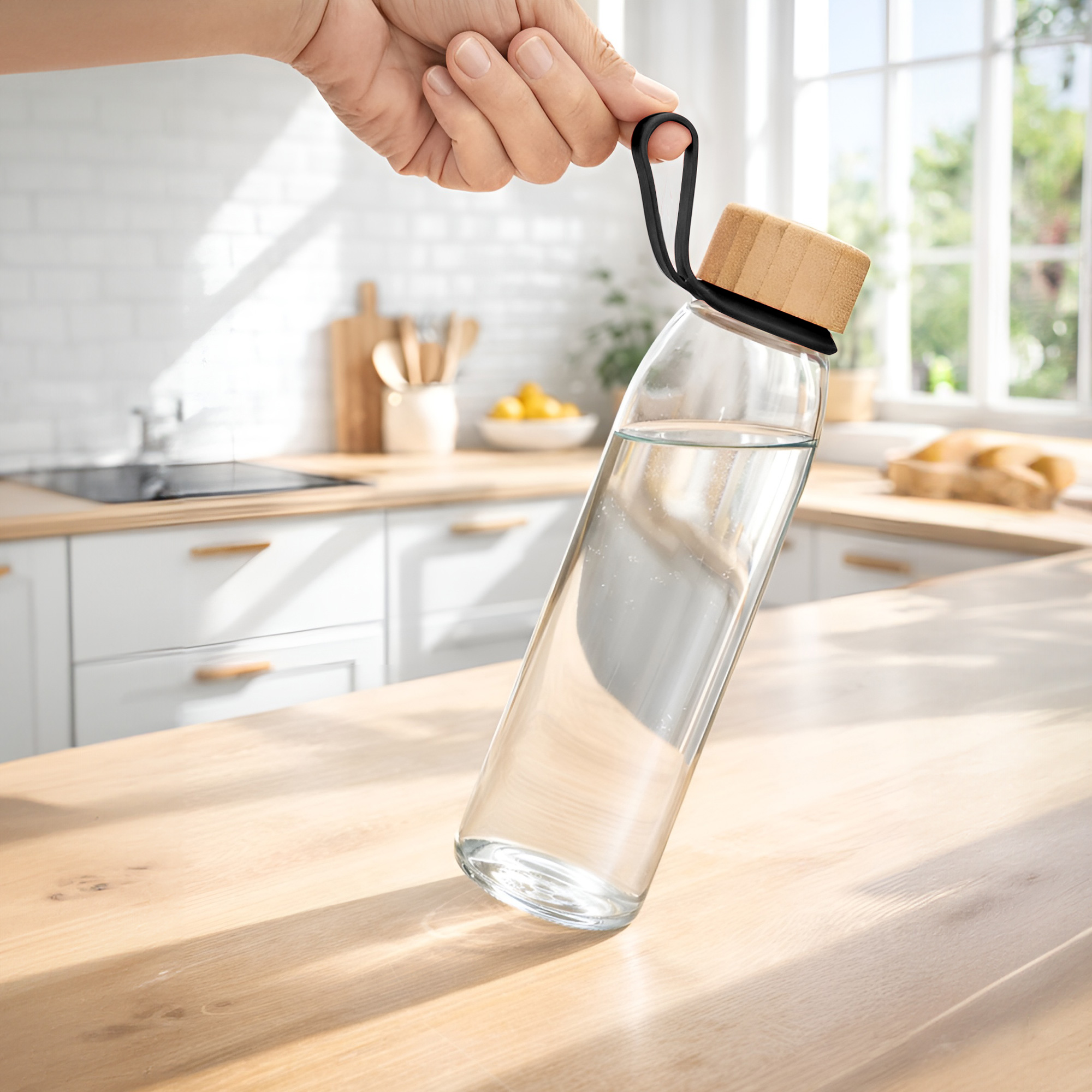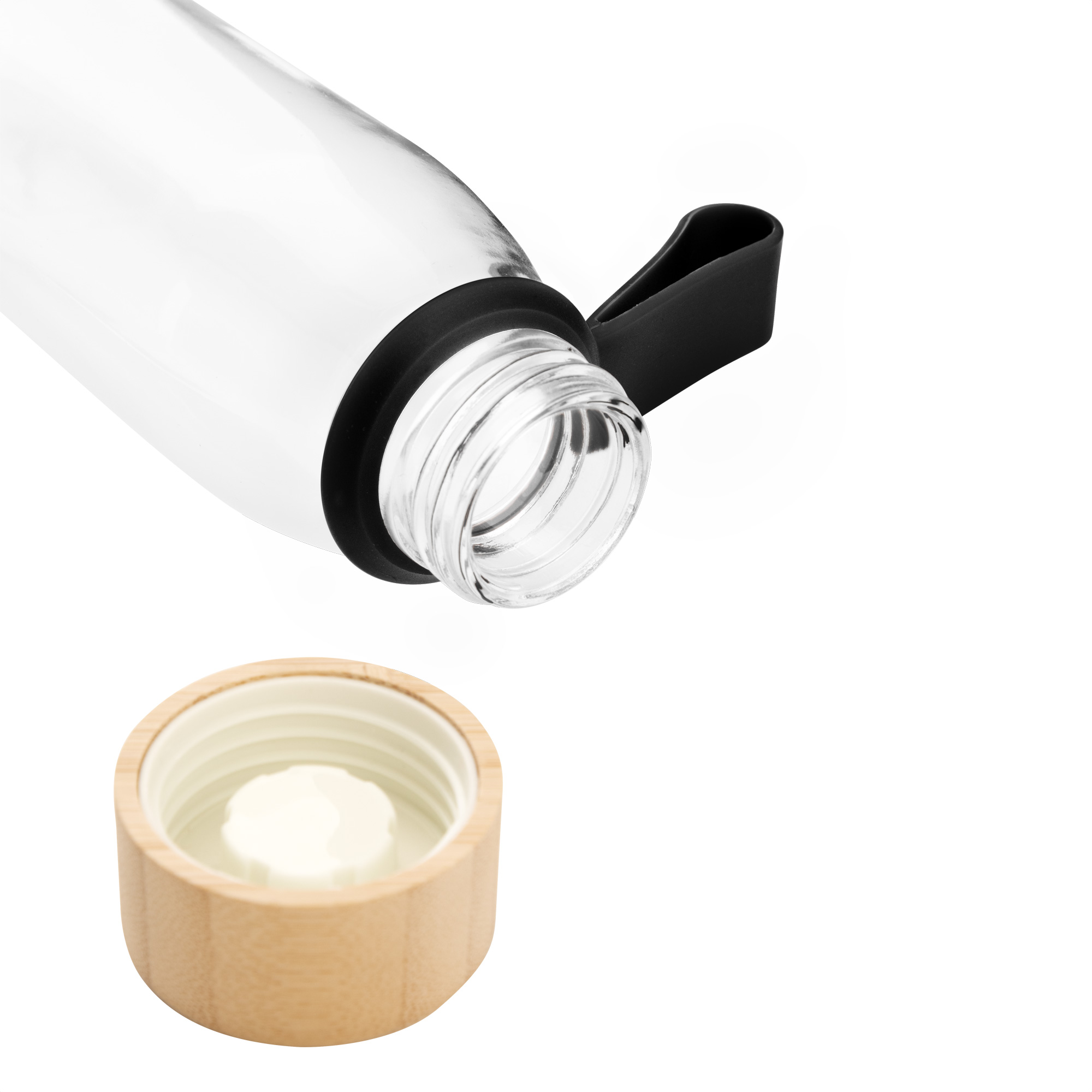 Botella de vidrio. Tapa de bambú, polipropileno y anillo de silicona antiderrame. Correa de silicona de diferentes colores.